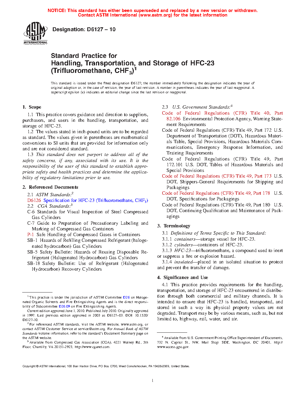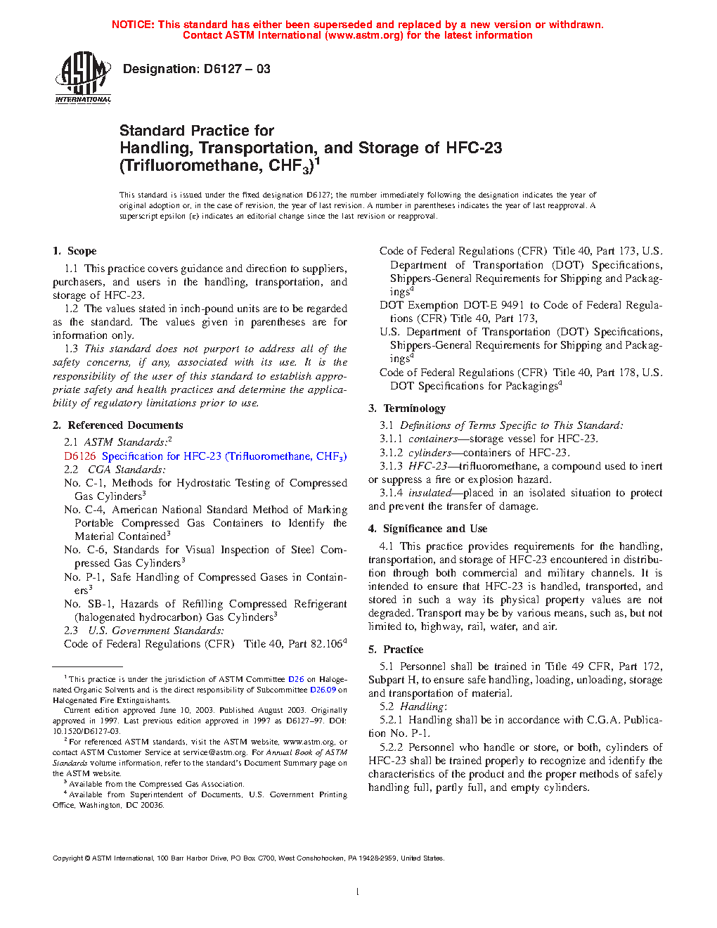 This practice provides requirements for the handling, transportation, and storage of HFC-23 encountered in distribution through both commercial and military channels. It is intended to ensure that HFC-23 is handled, transported, and stored in such a way its physical property values are not degraded. Transport may be by various means, such as, but not limited to, highway, rail, water, and air.