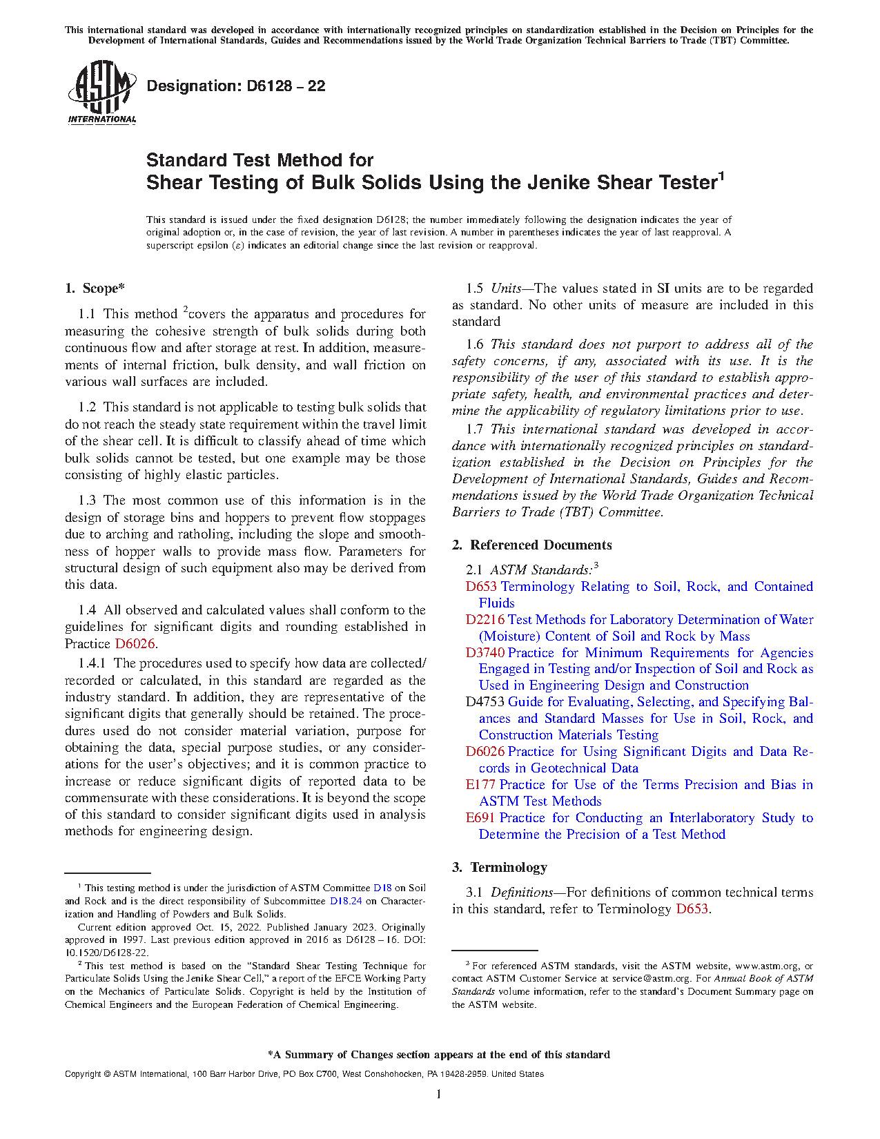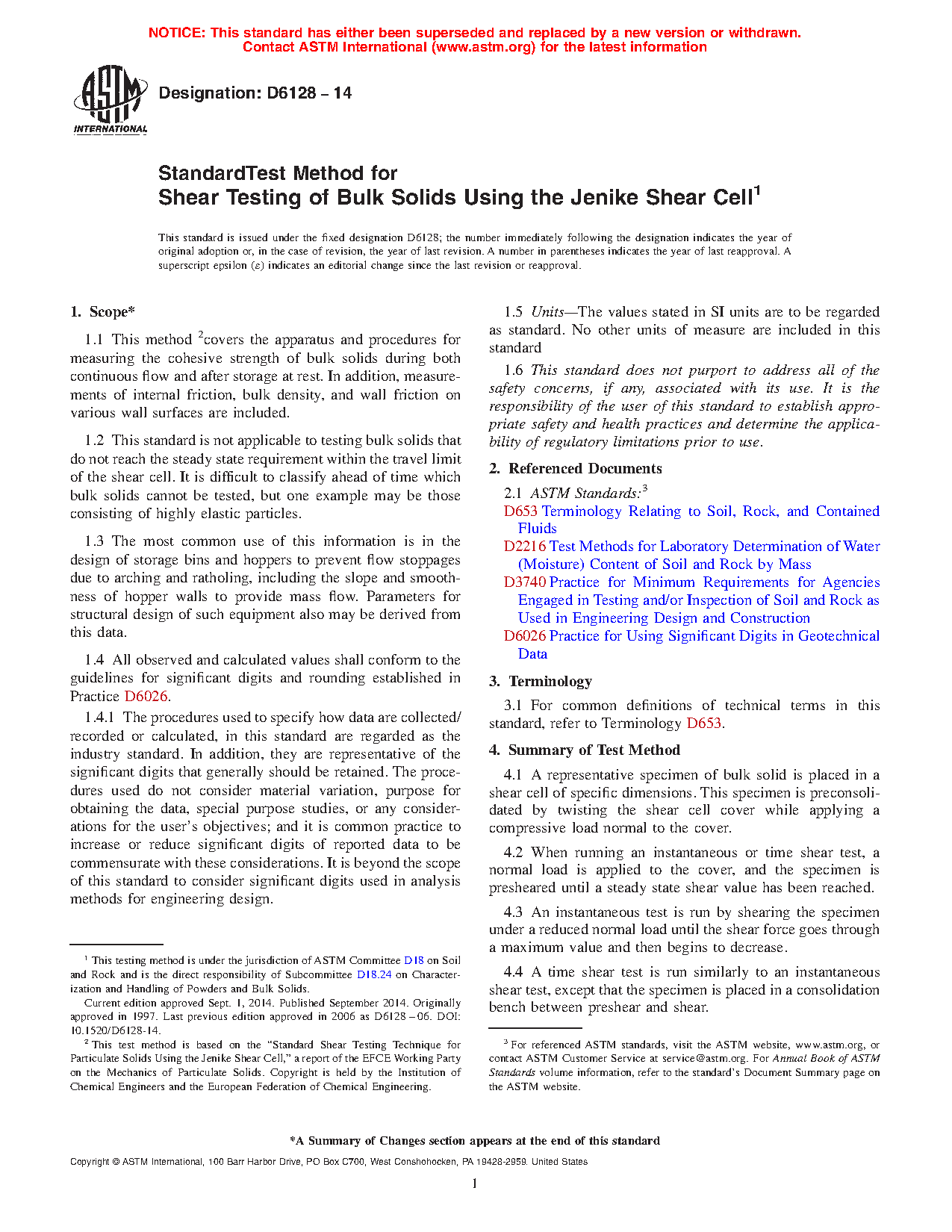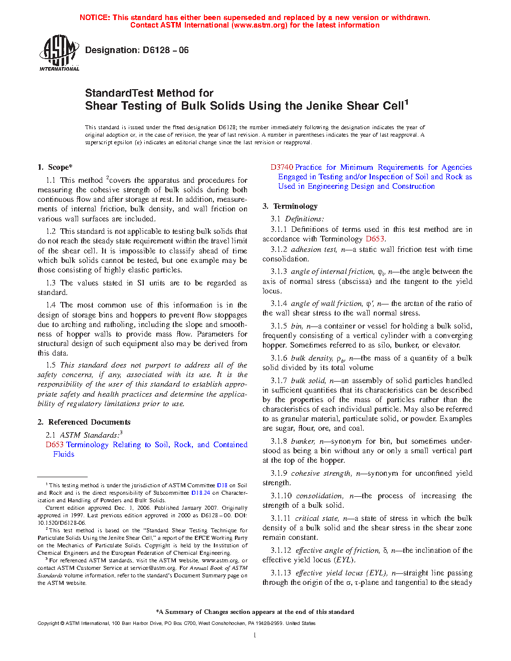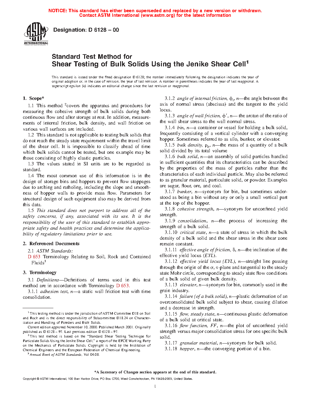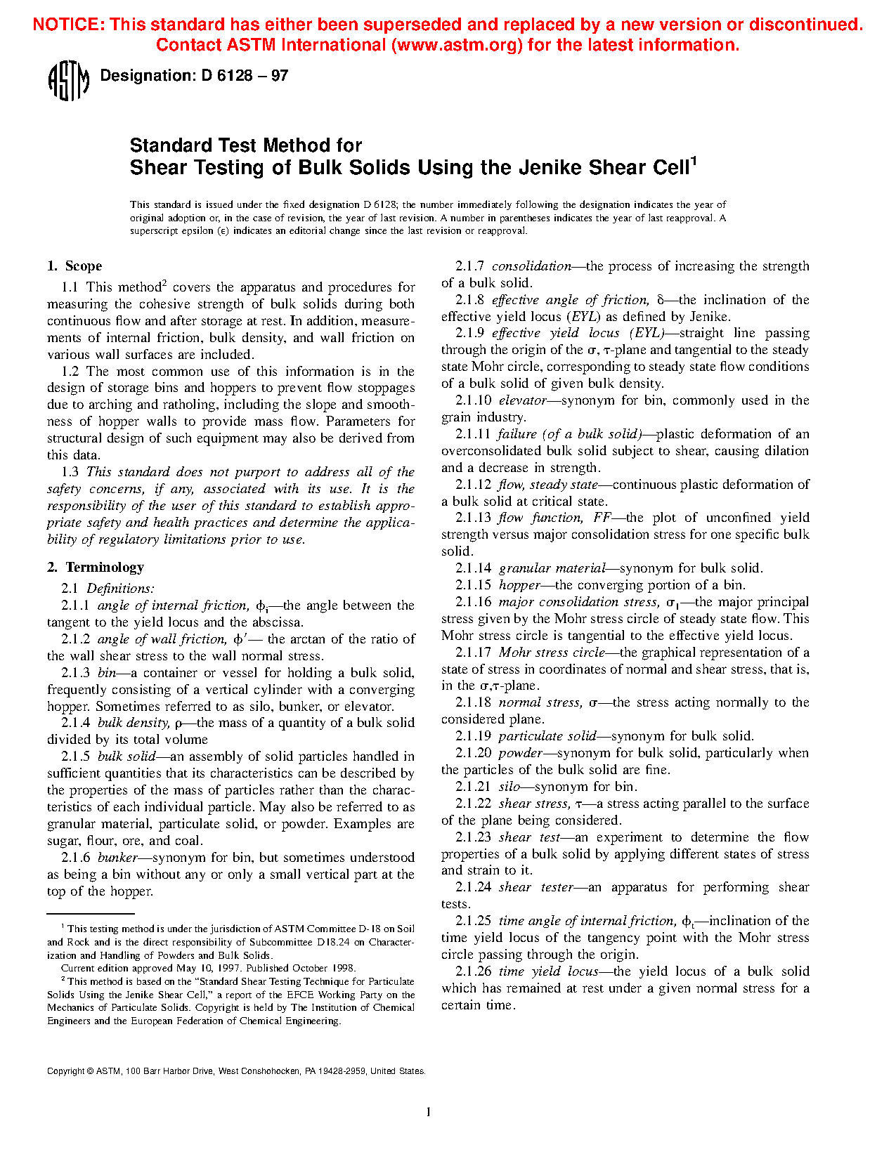 1.1 This method 2covers the apparatus and procedures for measuring the cohesive strength of bulk solids during both continuous flow and after storage at rest. In addition, measurements of internal friction, bulk density, and wall friction on various wall surfaces are included.