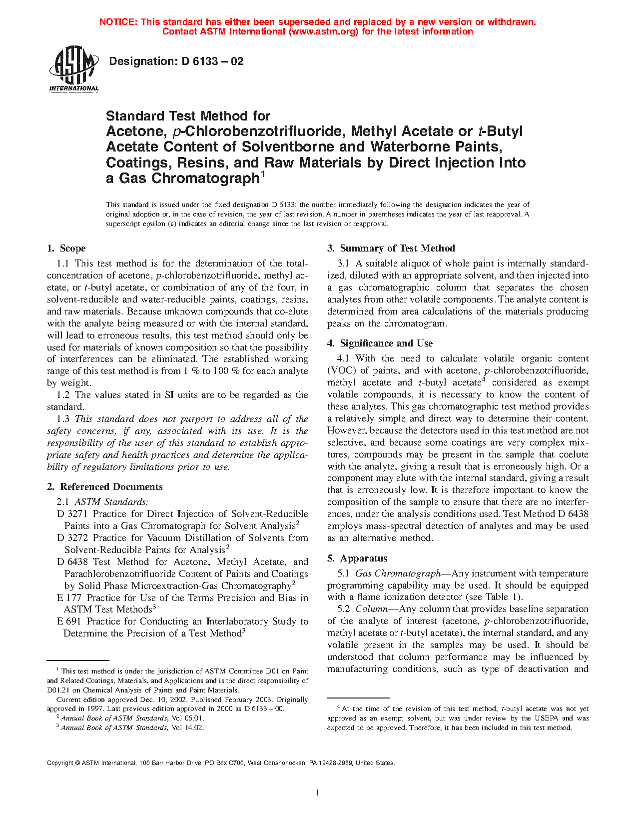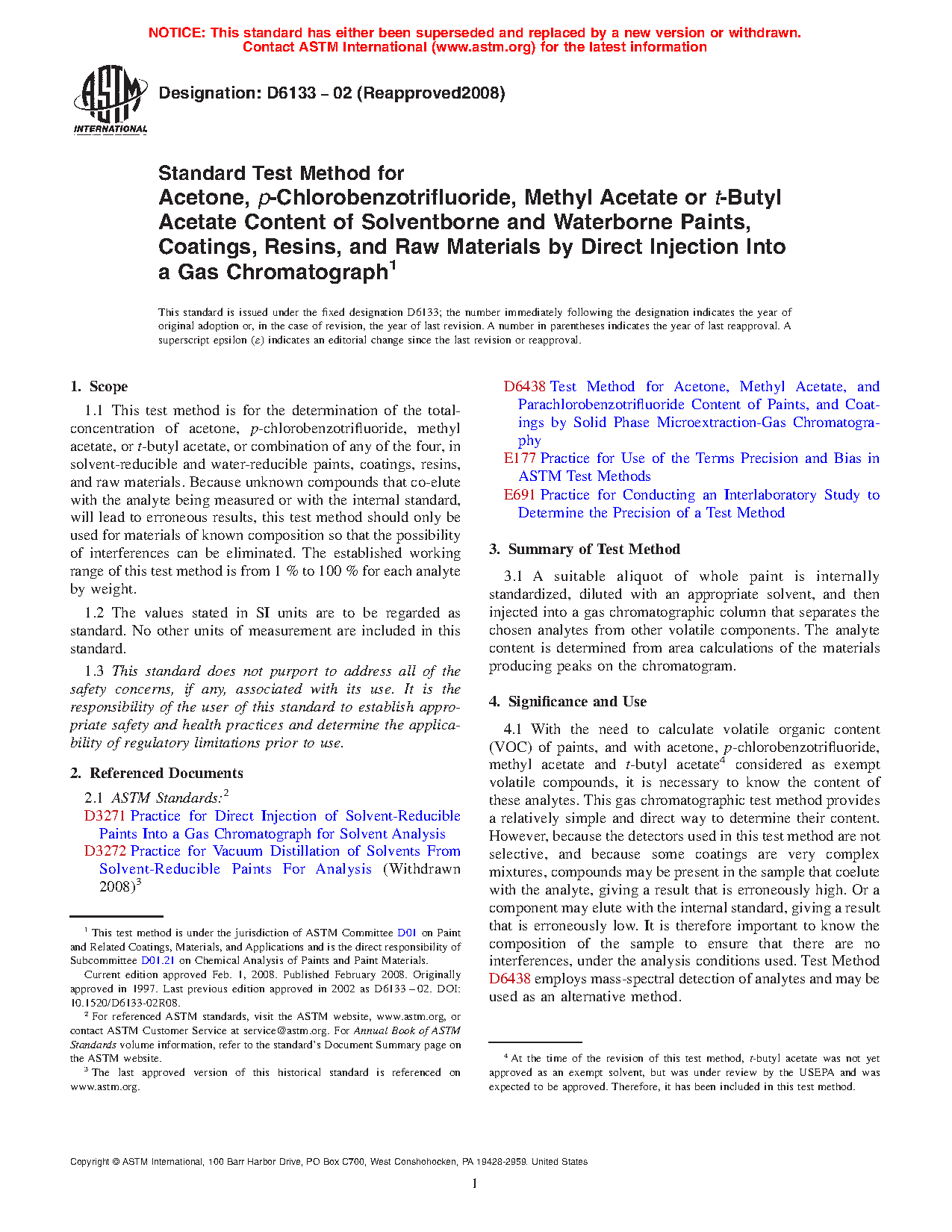 1.1 This test method is for the determination of the total-concentration of acetone, p-chlorobenzotrifluoride (pCBTF), methyl acetate, or t-butyl acetate (tBAc), or combination of any of the four, in solvent-reducible and water-reducible paints, coatings, resins, and raw materials. Because unknown compounds that co-elute with the analyte being measured or with the internal standard, will lead to erroneous results, this test method should only be used for materials of known composition so that the possibility of interferences can be eliminated. The established working range of this test method is from 1 % to 100 % for each analyte by weight.