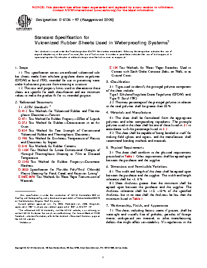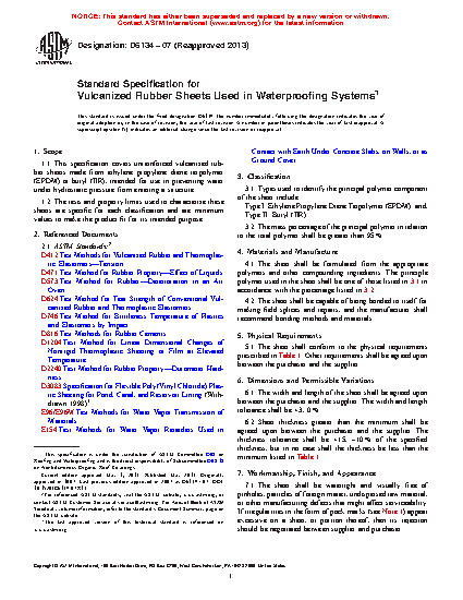 Standard Specification for Vulcanized Rubber Sheets Used in Waterproofing Systems