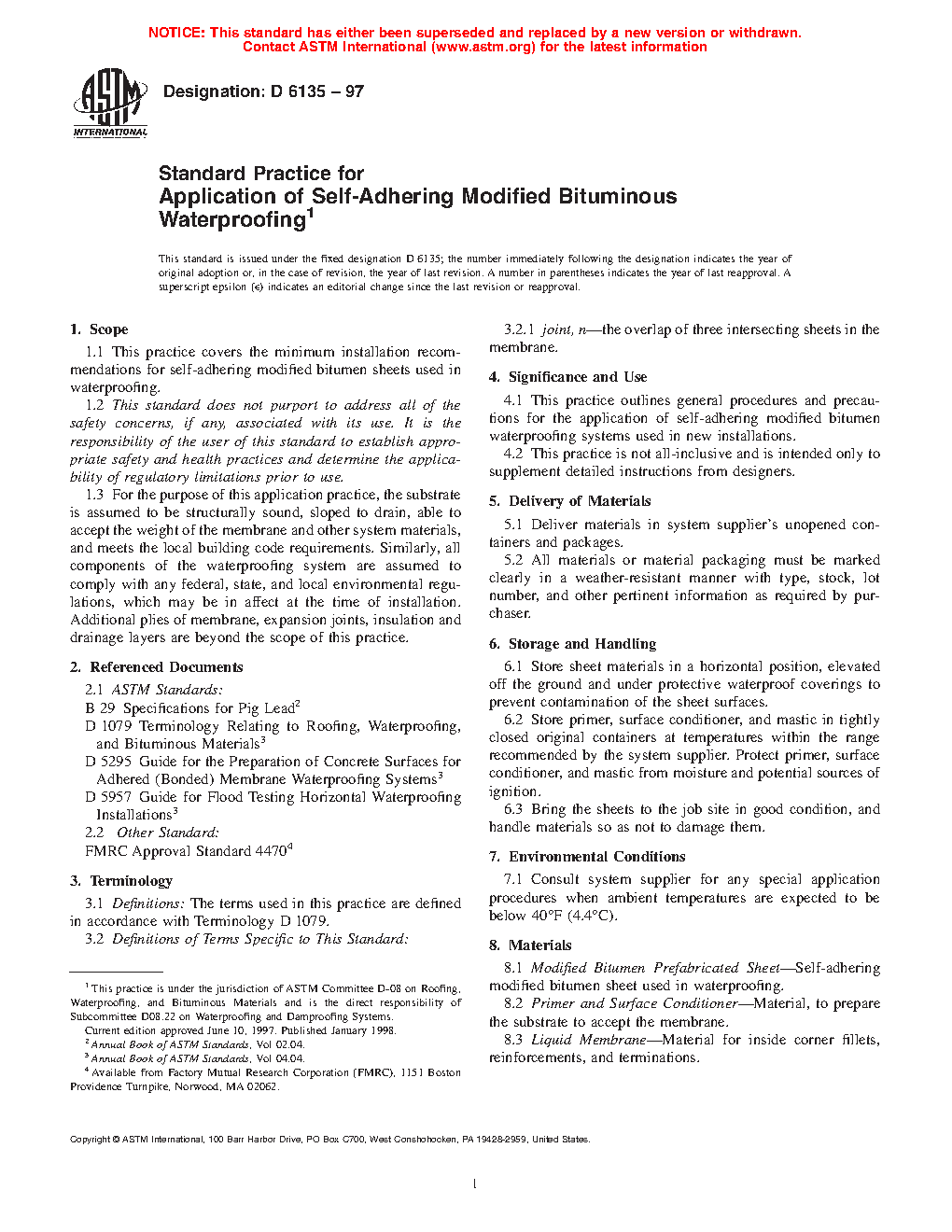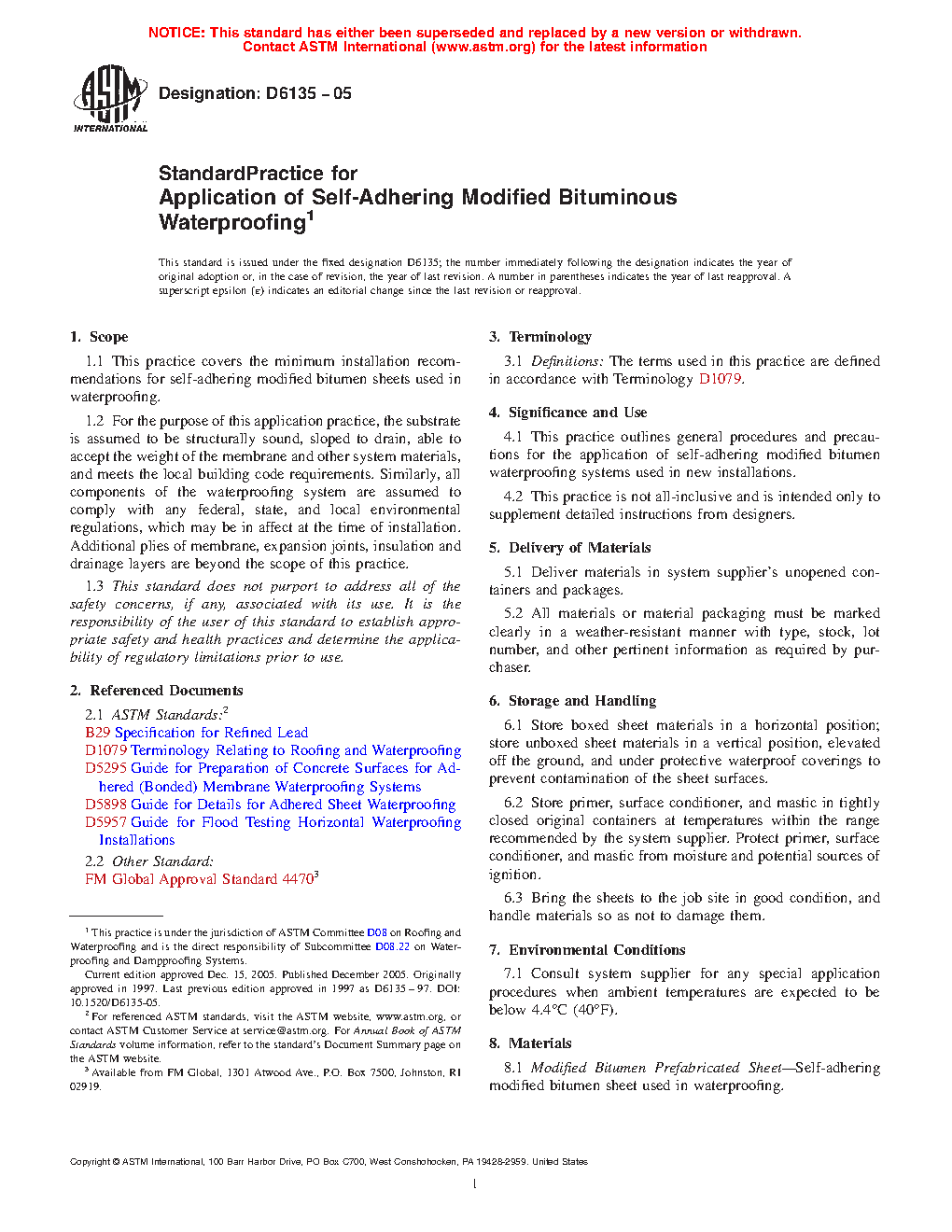 1.1 This practice covers the minimum installation recommendations for self-adhering modified bitumen sheets used in waterproofing.