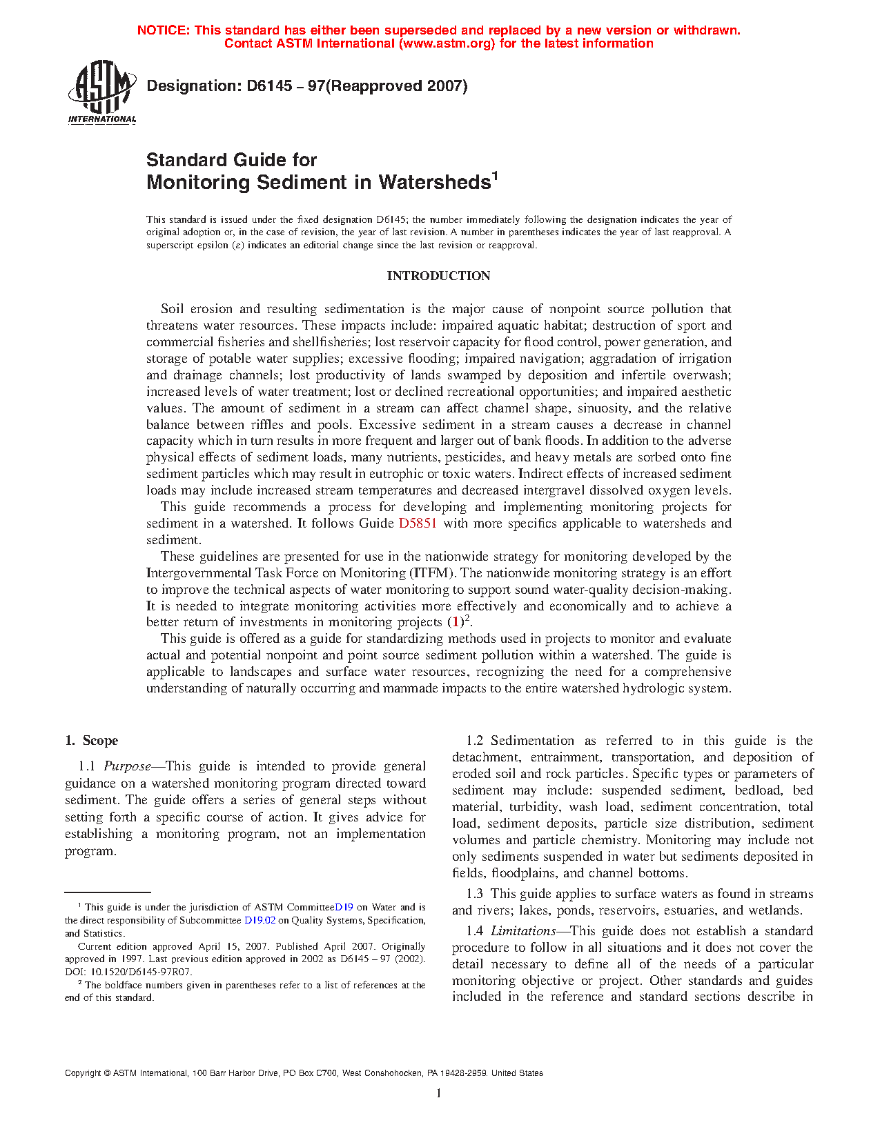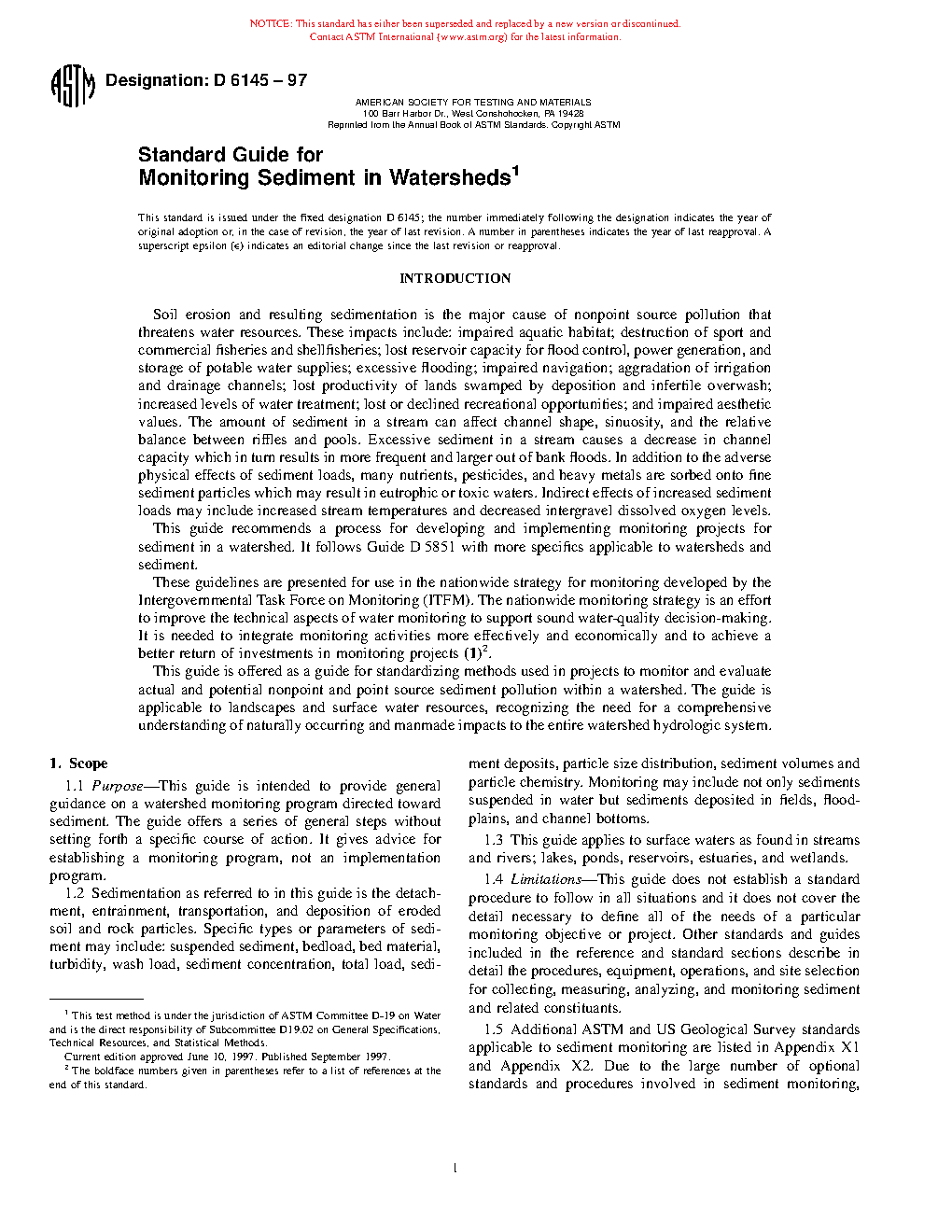 1.4 Limitations—This guide does not establish a standard procedure to follow in all situations and it does not cover the detail necessary to define all of the needs of a particular monitoring objective or project. Other standards and guides included in the reference and standard sections describe in detail the procedures, equipment, operations, and site selection for collecting, measuring, analyzing, and monitoring sediment and related constituants.