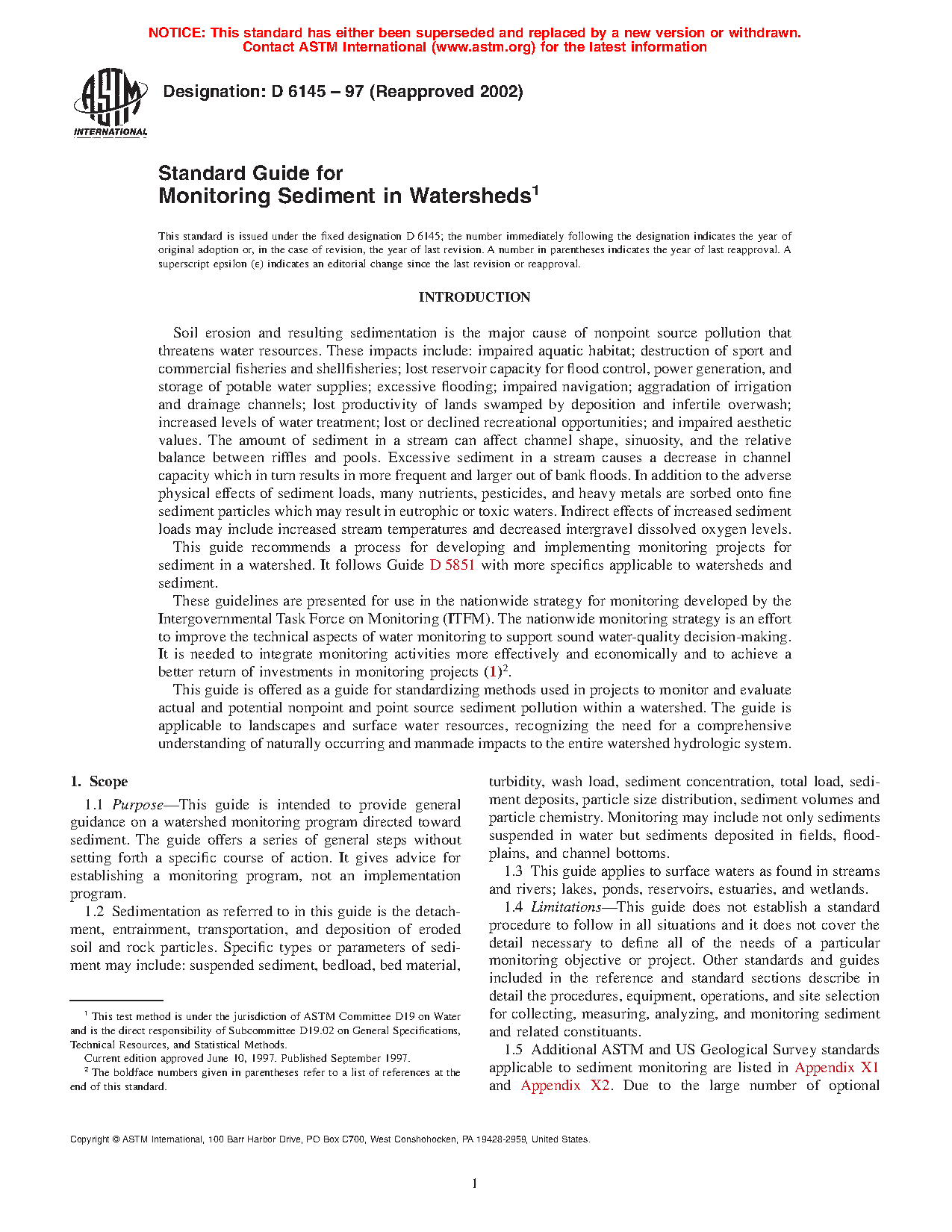 1.5 Additional ASTM and U.S. Geological Survey standards applicable to sediment monitoring are listed in Appendix X1 and Appendix X2. Due to the large number of optional standards and procedures involved in sediment monitoring, most individual standards are not referenced in this document. Standards and procedures have been grouped in the appendices according to the type of analyses or sampling that would be required for a specific type of measurement or monitoring.