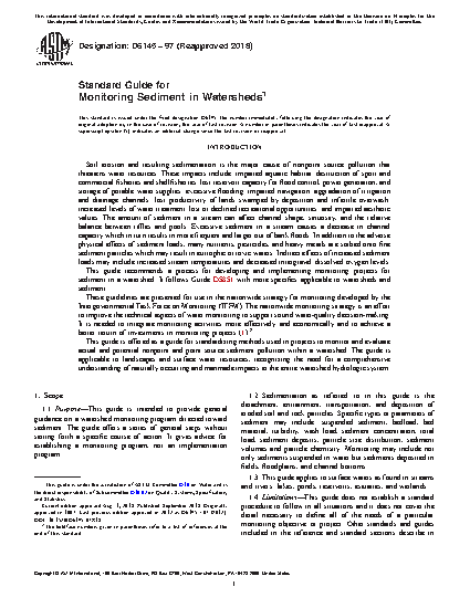 1.1 Purpose—This guide is intended to provide general guidance on a watershed monitoring program directed toward sediment. The guide offers a series of general steps without setting forth a specific course of action. It gives advice for establishing a monitoring program, not an implementation program.