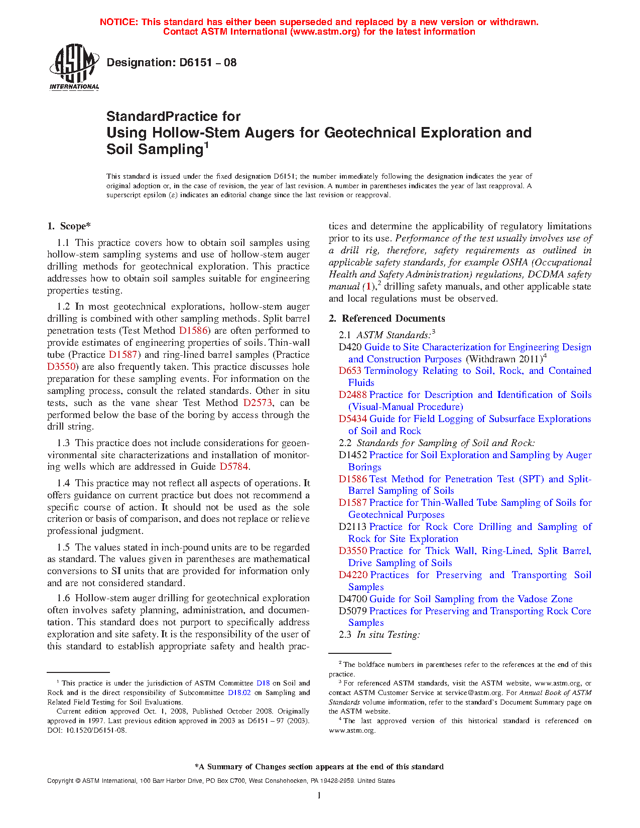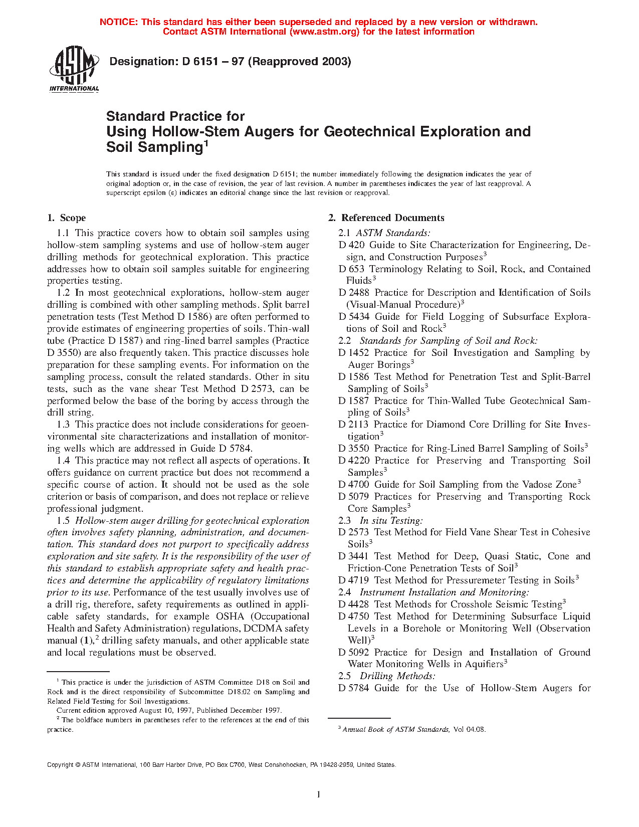 1.2 In most geotechnical explorations, hollow-stem auger drilling is combined with other sampling methods. Split barrel penetration tests (Test Method D 1586) are often performed to provide estimates of engineering properties of soils. Thin-wall tube (Practice D 1587) and ring-lined barrel samples (Practice D 3550) are also frequently taken. This practice discusses hole preparation for these sampling events. For information on the sampling process, consult the related standards. Other in situ tests, such as the vane shear Test Method D 2573, can be performed below the base of the boring by access through the drill string.