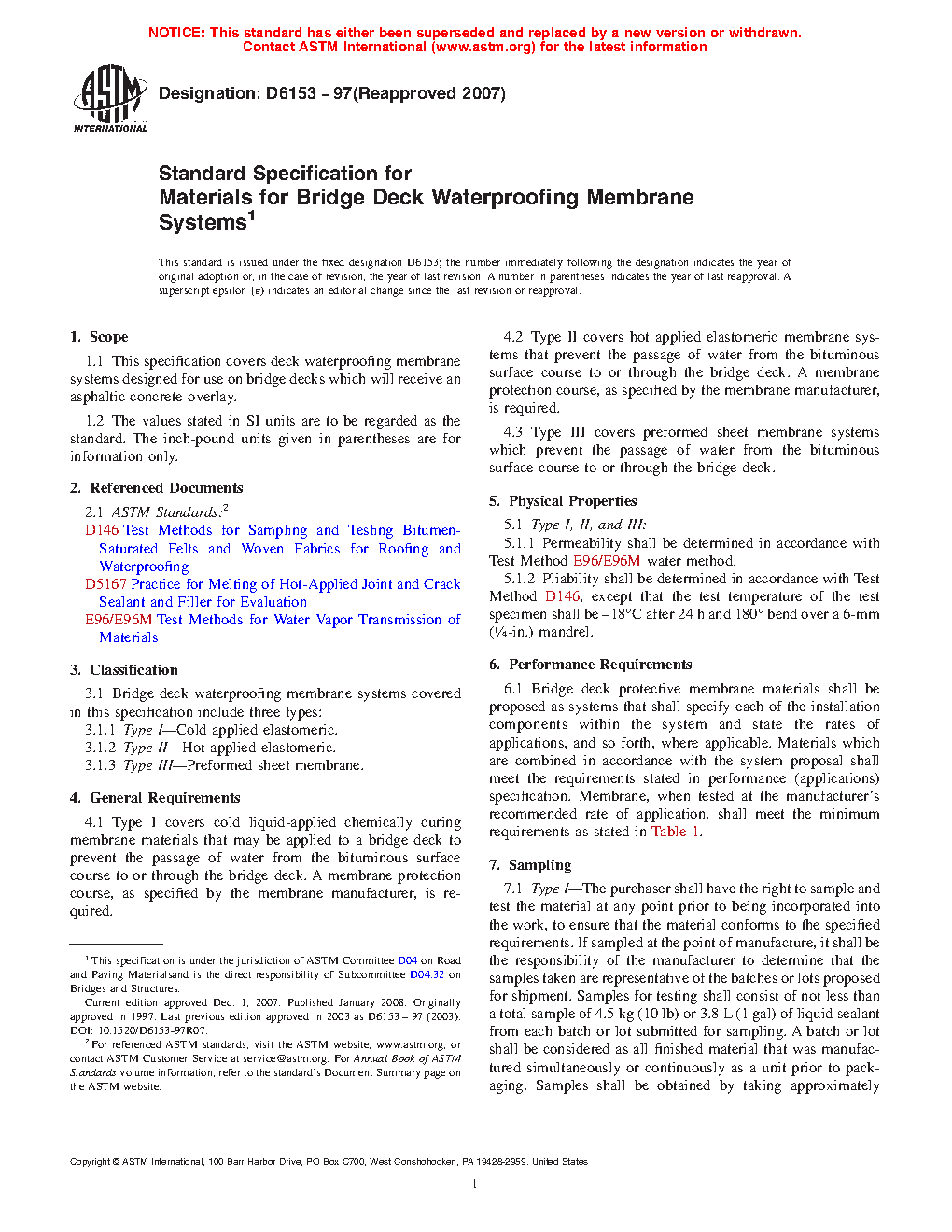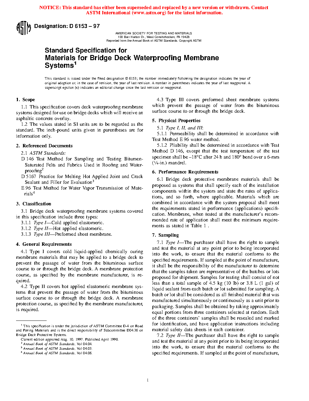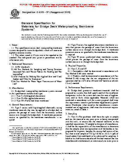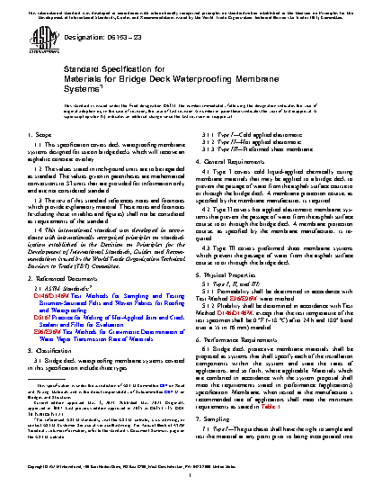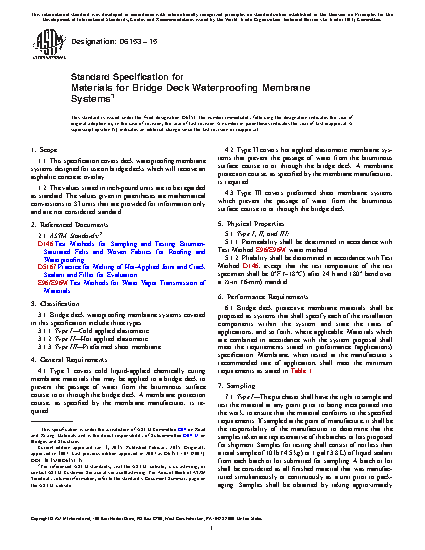 This specification covers three types of deck waterproofing membrane systems designed for use on bridge decks which will receive an asphaltic concrete overlay. Type I are cold liquid-applied chemically curing membrane materials that that require a membrane protection course. Type II, on the other hand, are hot applied elastomeric membrane systems that also require a membrane protection course. And finally, Type III are preformed sheet membrane systems. All types are applied to a bridge deck to prevent the passage of water from the bituminous surface course to or through the bridge deck. Membrane systems shall be sampled as appropriate for each type, and shall conform to performance requirements and physical properties as to permeability, and pliability.