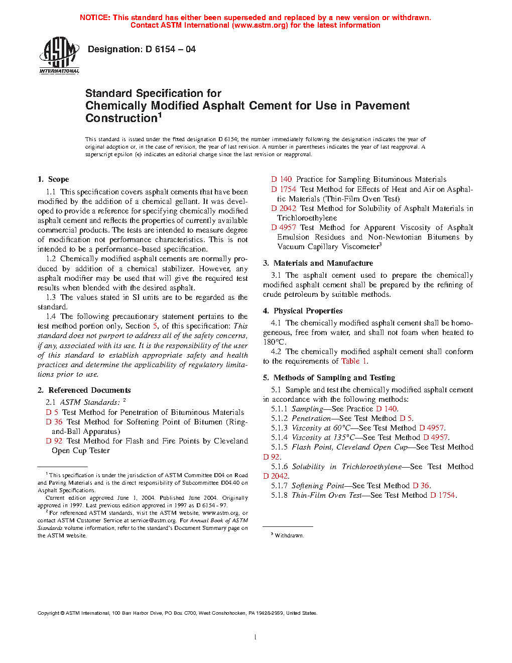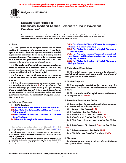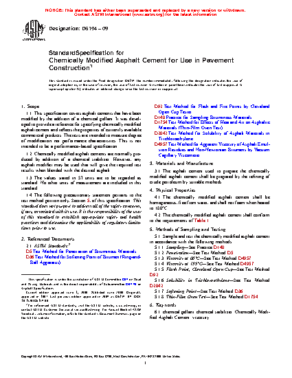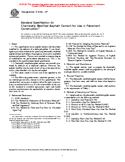 This specification covers asphalt cements that have been modified by the addition of a chemical gellant. The asphalt cement used to prepare the chemically modified asphalt cement shall be prepared by the refining of crude petroleum by suitable methods. Chemically modified asphalt cements are normally produced by addition of a chemical stabilizer. However, any asphalt modifier may be used that will give the required test results when blended with the desired asphalt. Different test methods shall be performed in order to determine the following properties of the cement: penetration, viscosity, flash point using Cleveland open cup, solubility in trichloroethylene, softening point, residue from thin-film oven test.