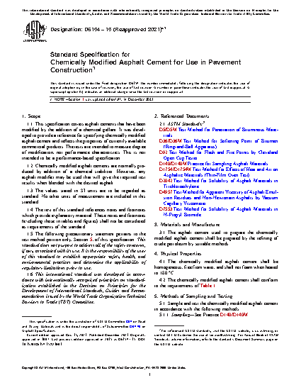1.1 This specification covers asphalt cements that have been modified by the addition of a chemical gellant. It was developed to provide a reference for specifying chemically modified asphalt cement and reflects the properties of currently available commercial products. The tests are intended to measure degree of modification not performance characteristics. This is not intended to be a performance–based specification.