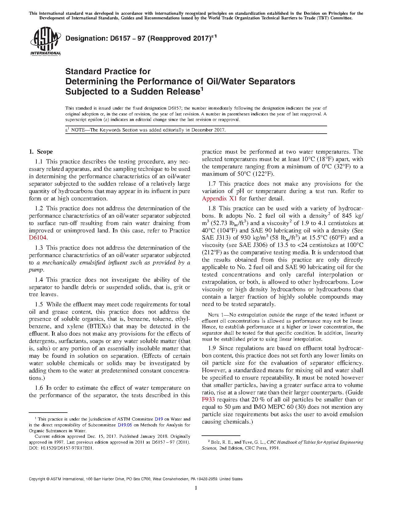 1.9 Since regulations are based on effluent total hydrocarbon content, this practice does not set forth any lower limits on oil particle size for the evaluation of separator efficiency. However, a standardized means for mixing oil and water shall be specified to ensure repeatability. It must be noted however that smaller particles, having a greater surface area to volume ratio, rise at a slower rate than their larger counterparts. (Guide F933 requires that 20 % of all oil particles be smaller than or equal to 50 μm and IMO MEPC 60 (30) does not mention any particle size requirements but asks the user to avoid emulsion causing chemicals.)