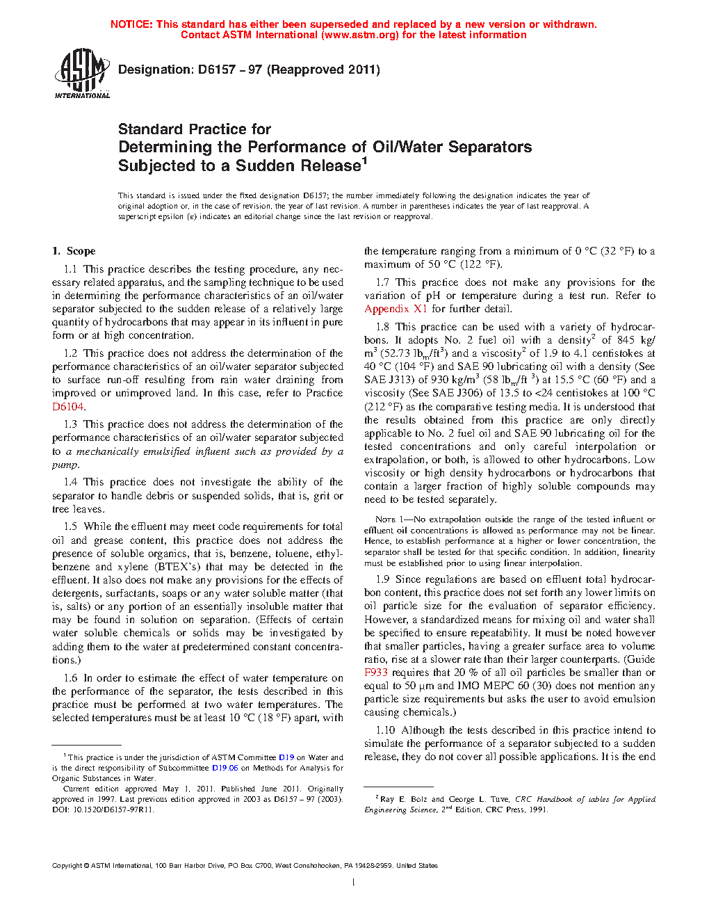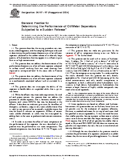 1.1 This practice describes the testing procedure, any necessary related apparatus, and the sampling technique to be used in determining the performance characteristics of an oil/water separator subjected to the sudden release of a relatively large quantity of hydrocarbons that may appear in its influent in pure form or at high concentration.