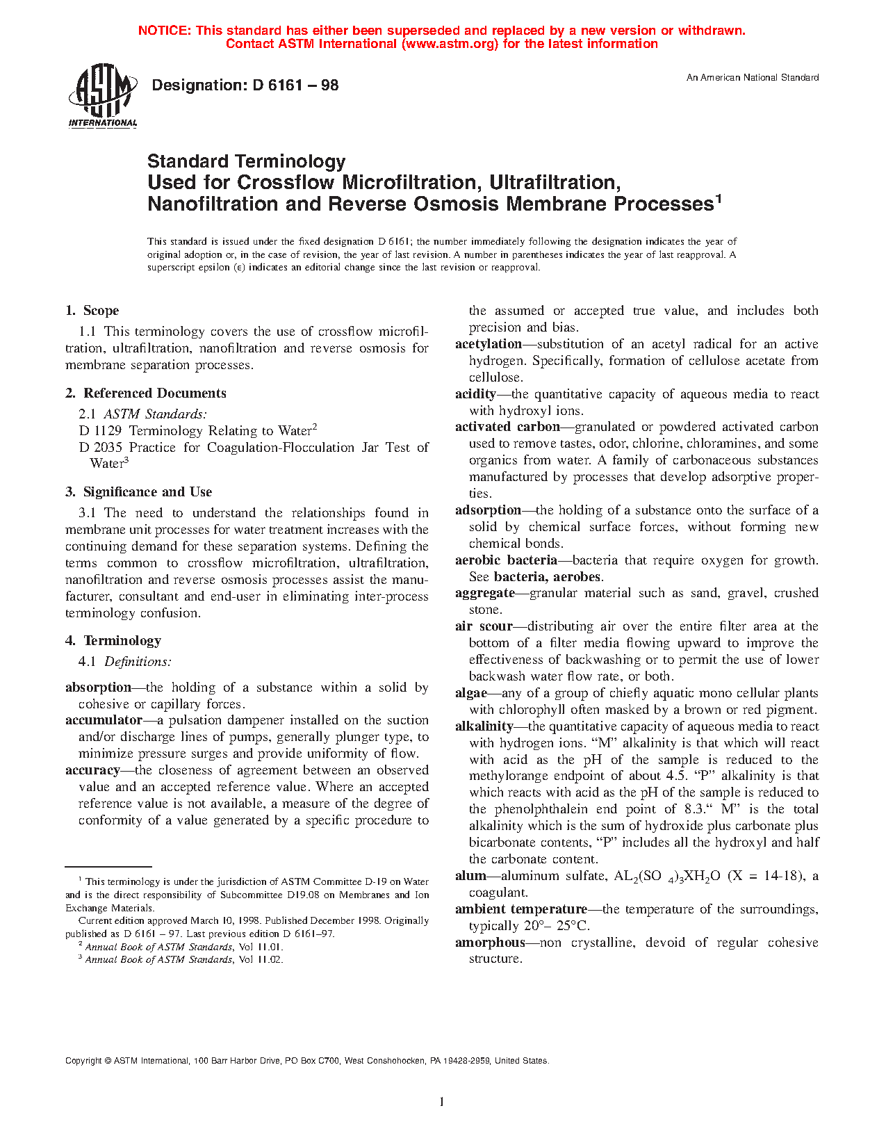 4.1 The need to understand the relationships found in membrane unit processes for water treatment increases with the continuing demand for these separation systems. Defining the terms common to microfiltration, ultrafiltration, nanofiltration, and reverse osmosis processes assist the manufacturer, consultant, and end-user in eliminating inter-process terminology confusion. This standard expands the definitions found in Terminology D1129.