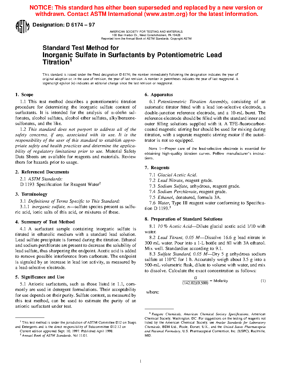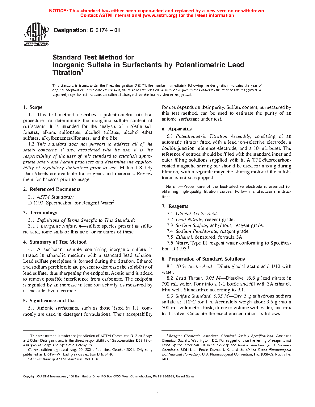 1.1 This test method describes a potentiometric titration procedure for determining the inorganic sulfate content of surfactants. It is intended for the analysis of -olefin sulfonates, alkane sulfonates, alcohol sulfates, alcohol ether sulfates, alkylbenzenesulfonates, and the like.