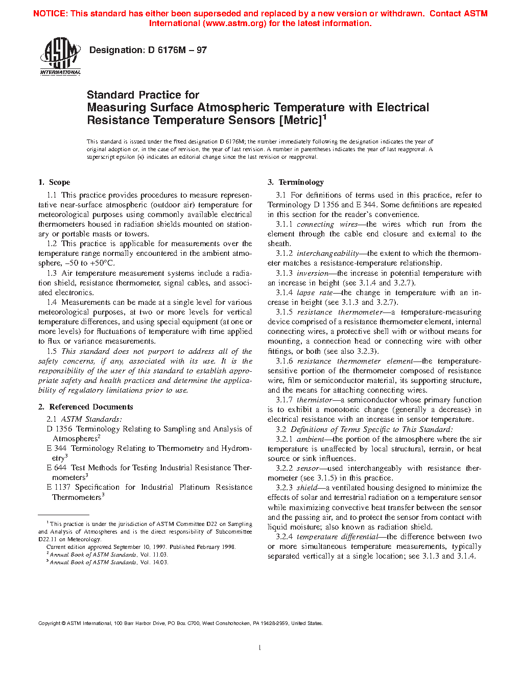 1.1 This practice provides procedures to measure representative near-surface atmospheric (outdoor air) temperature for meteorological purposes using commonly available electrical thermometers housed in radiation shields mounted on stationary or portable masts or towers.