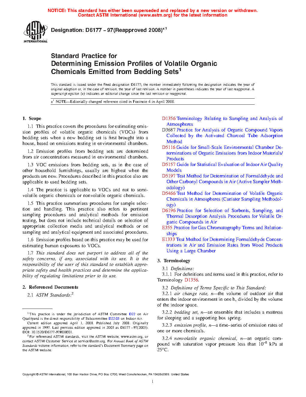 1.1 This practice covers the procedures for estimating emission profiles of volatile organic chemicals (VOCs) from bedding sets when a new bedding set is first brought into a house, based on emissions testing in environmental chambers.