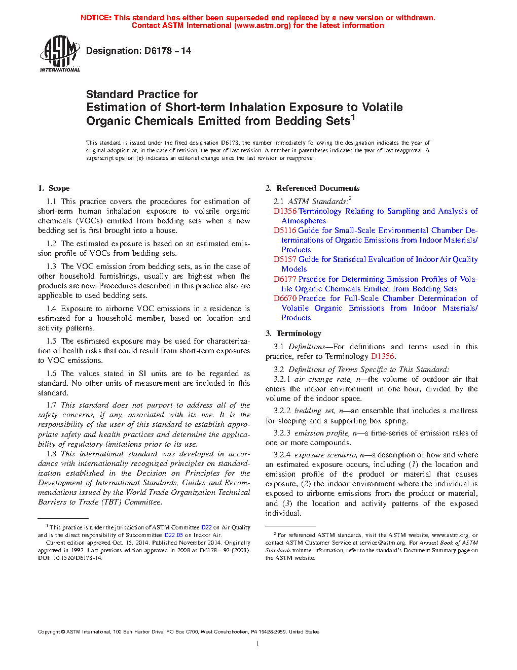 1.1 This practice describes the procedures for estimation of short-term human inhalation exposure to volatile organic compounds (VOCs) emitted from bedding sets when a new bedding set is first brought into a bedroom.