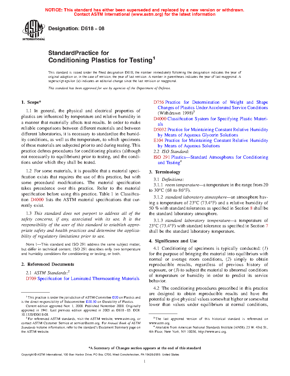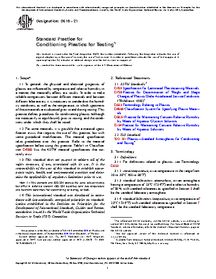 1.1 In general, the physical and electrical properties of plastics are influenced by temperature and relative humidity in a manner that materially affects test results. In order to make reliable comparisons between different materials and between different laboratories, it is necessary to standardize the humidity conditions, as well as the temperature, to which specimens of these materials are subjected prior to and during testing. This practice defines procedures for conditioning plastics (although not necessarily to equilibrium) prior to testing, and the conditions under which they shall be tested.
