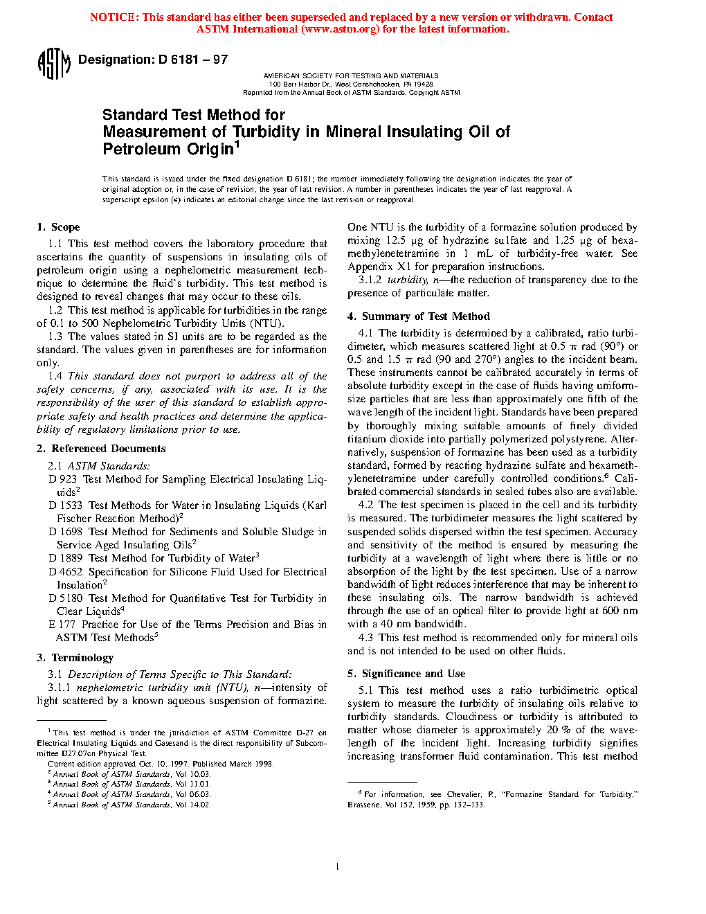 1.1 This test method covers the laboratory procedure that ascertains the quantity of suspensions in insulating oils of petroleum origin using a nephelometric measurement technique to determine the fluid's turbidity. This test method is designed to reveal changes that may occur to these oils.