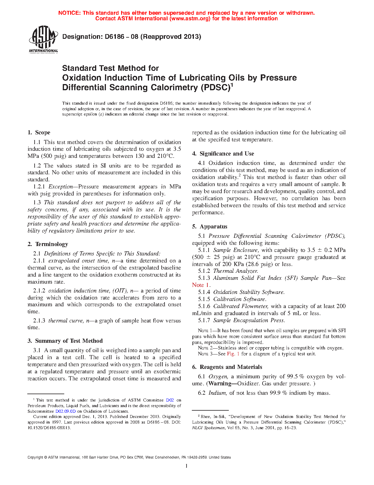 1.1 This test method covers the determination of oxidation induction time of lubricating oils subjected to oxygen at 3.5 MPa (500 psig) and temperatures between 130 °C and 210 °C.