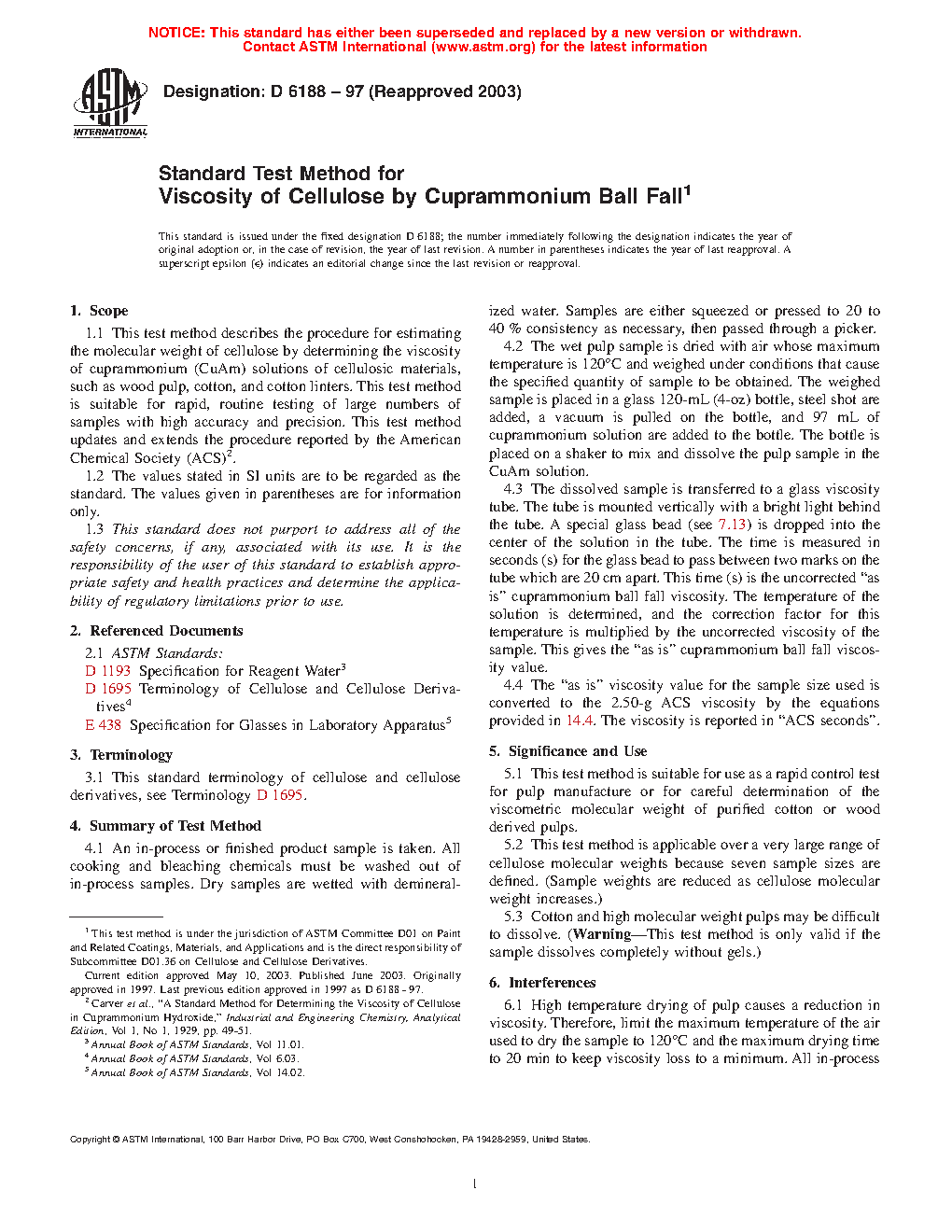1.1 This test method describes the procedure for estimating the molecular weight of cellulose by determining the viscosity of cuprammonium (CuAm) solutions of cellulosic materials, such as wood pulp, cotton, and cotton linters. This test method is suitable for rapid, routine testing of large numbers of samples with high accuracy and precision. This test method updates and extends the procedure reported by the American Chemical Society (ACS).2