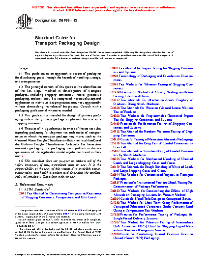 1.4 The user of this guide must be aware of the carrier rules regarding packaging for shipment via each mode of transportation in which the transport package may move, such as the National Motor Freight Classification (less-than truckload) and the Uniform Freight Classification (railroad). For hazardous materials packaging, the packaging must perform to the requirements of the applicable modal regulations listed in Section 2.