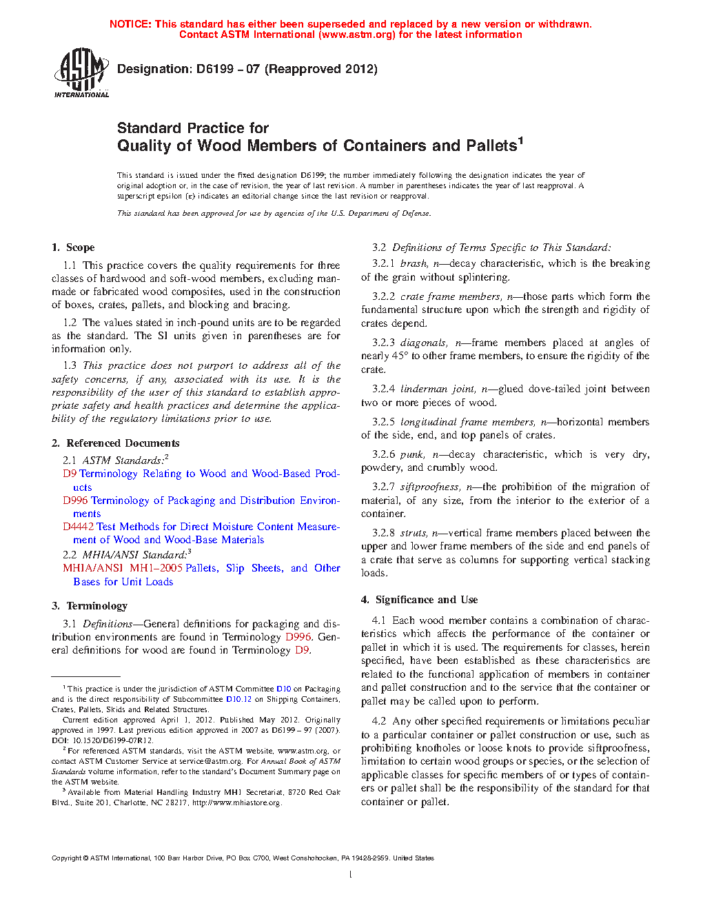 4.1 Each wood member contains a combination of characteristics which affects the performance of the container or pallet in which it is used. The requirements for classes, herein specified, have been established as these characteristics are related to the functional application of members in container and pallet construction and to the service that the container or pallet may be called upon to perform.