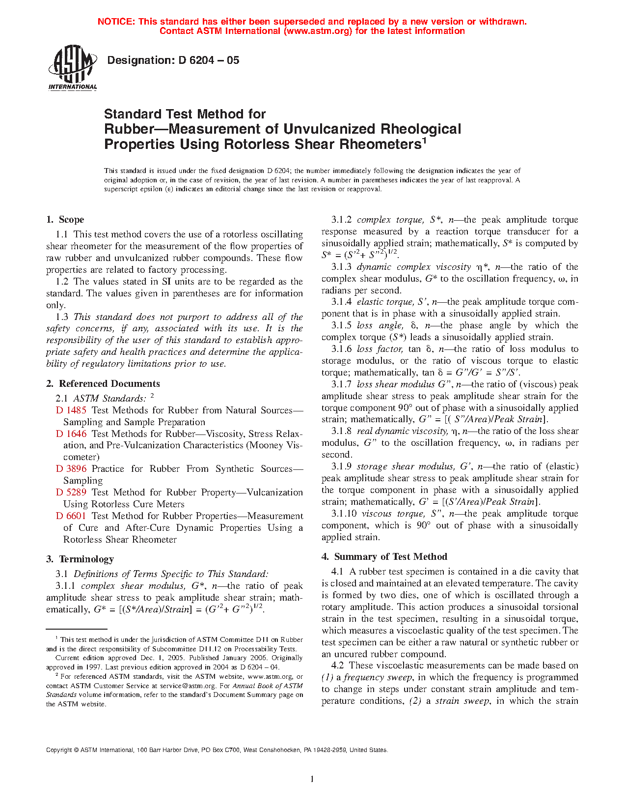 1.1 This test method covers the use of a rotorless oscillating shear rheometer for the measurement of the flow properties of raw rubber and unvulcanized rubber compounds. These flow properties are related to factory processing.