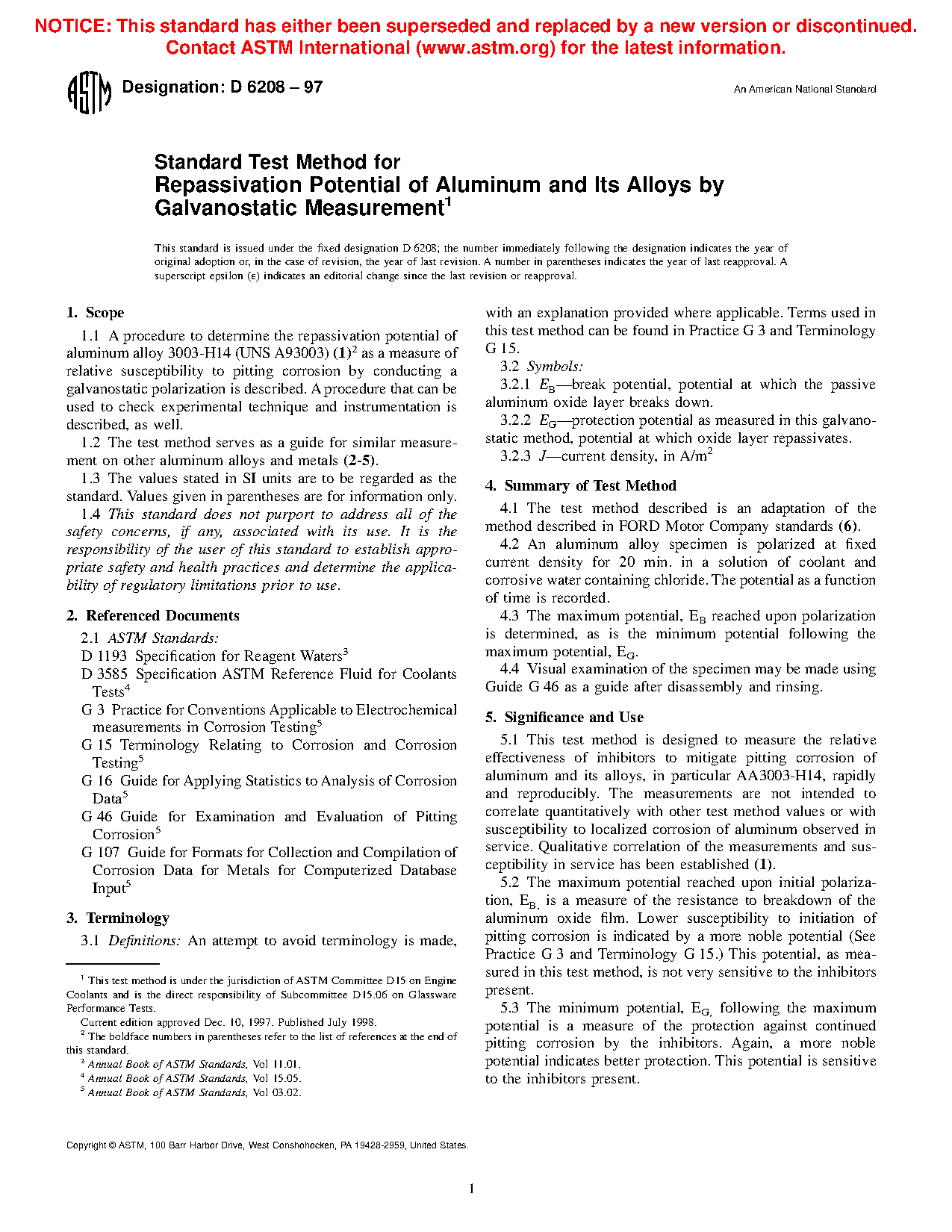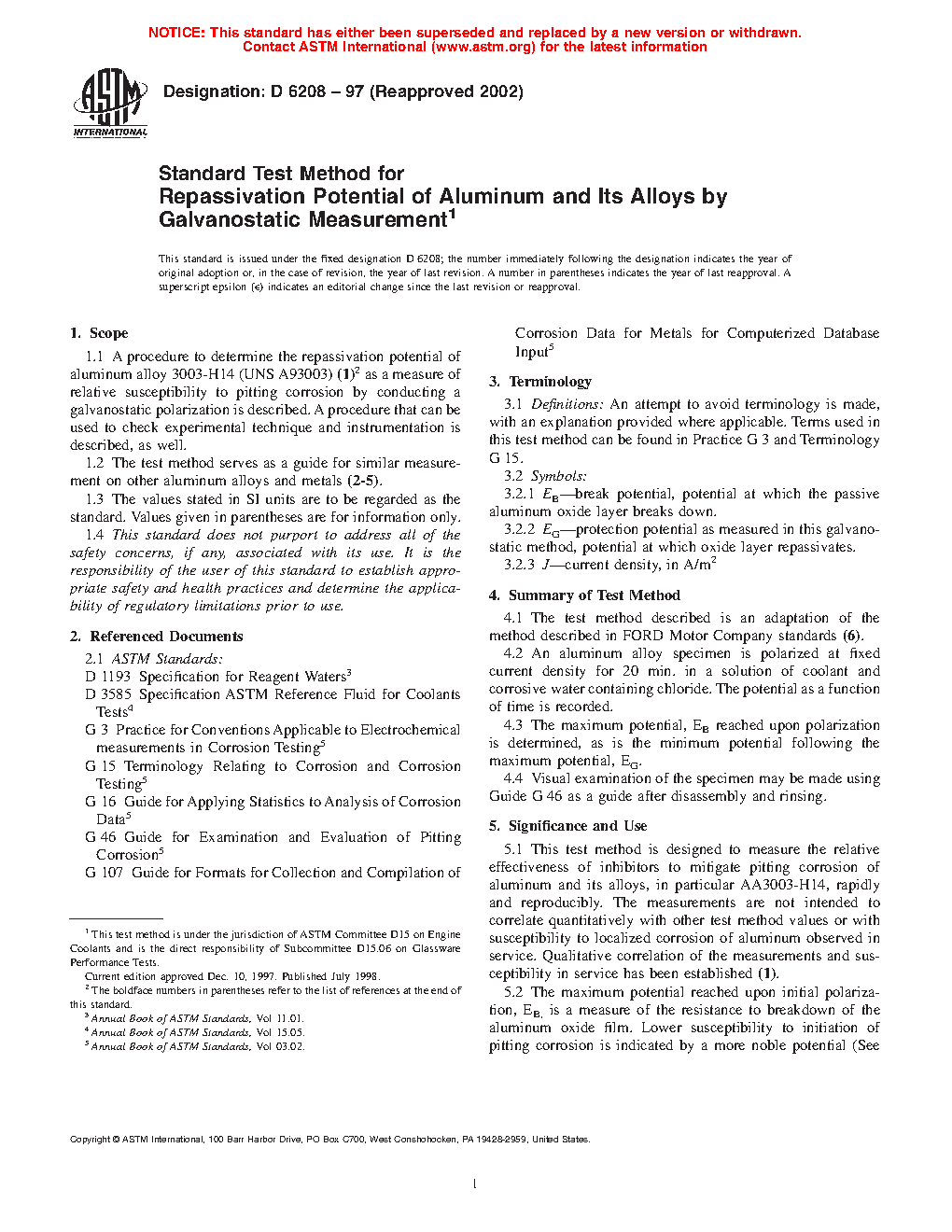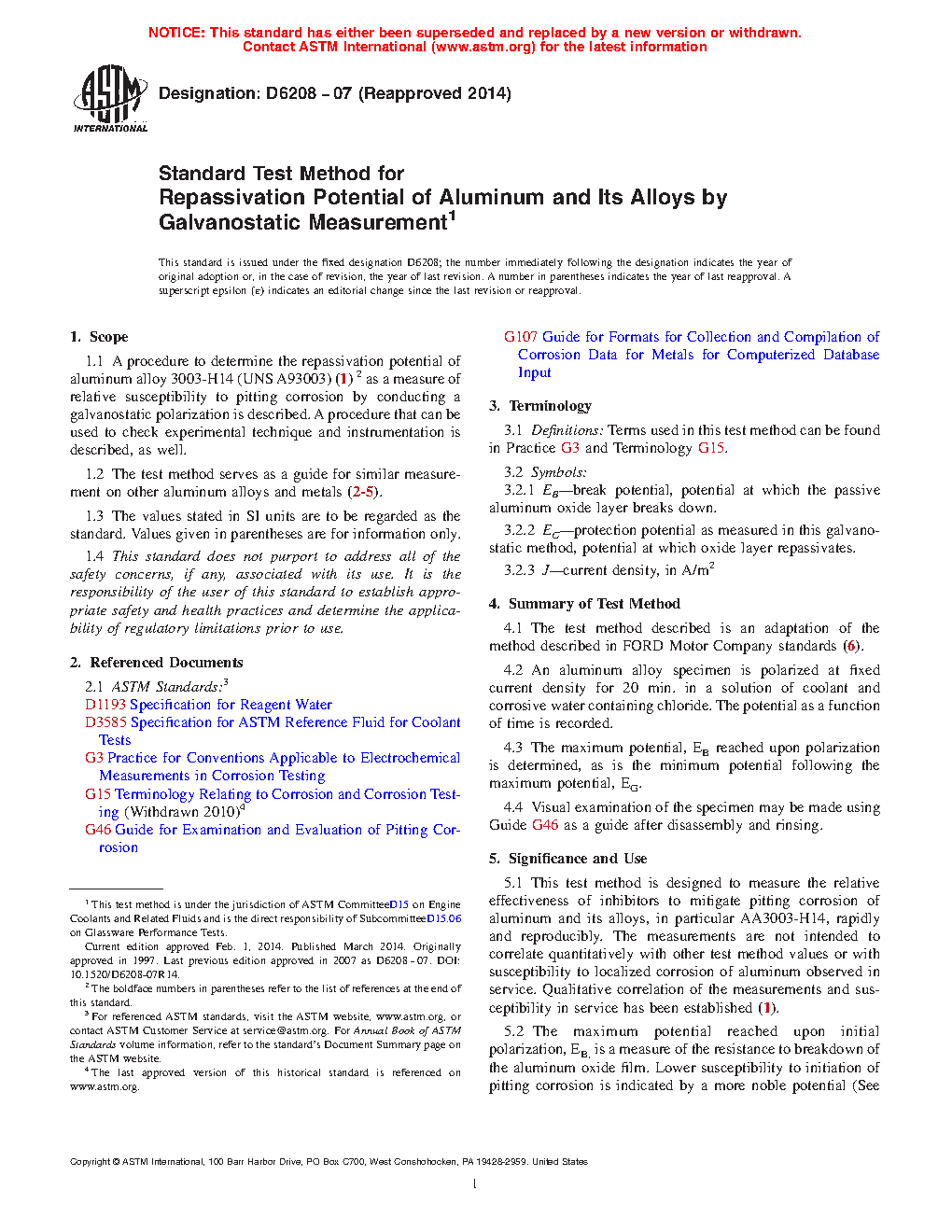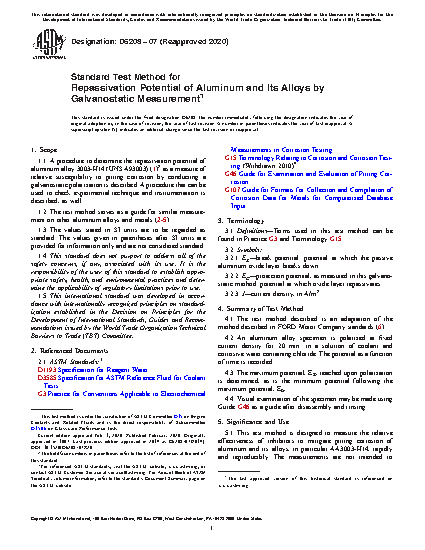 1.1 A procedure to determine the repassivation potential of aluminum alloy 3003-H14 (UNS A93003) (1)2 as a measure of relative susceptibility to pitting corrosion by conducting a galvanostatic polarization is described. A procedure that can be used to check experimental technique and instrumentation is described, as well.
