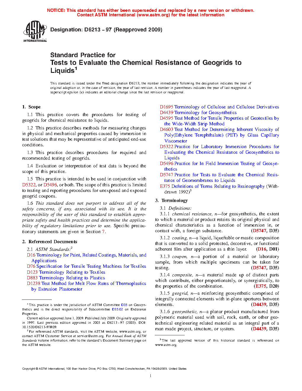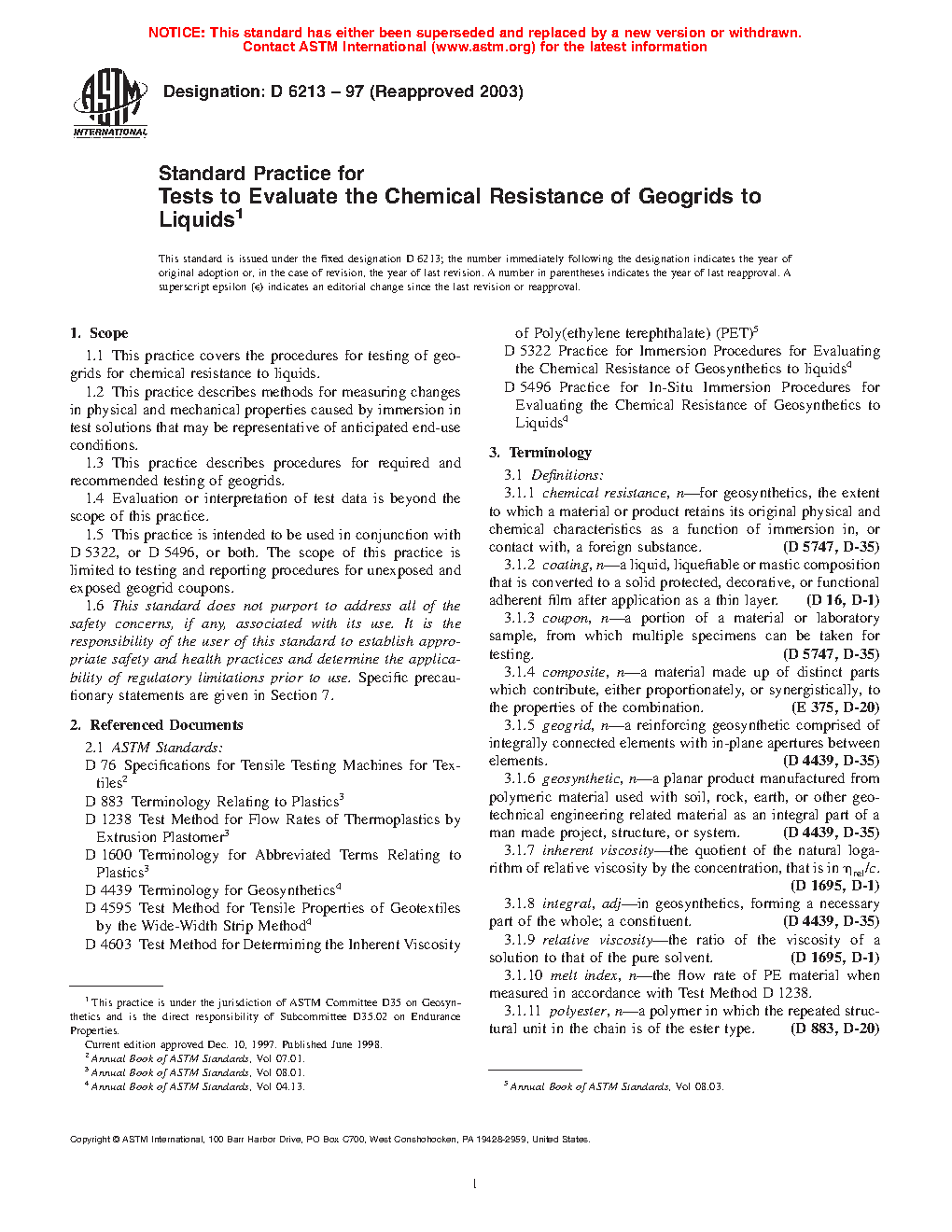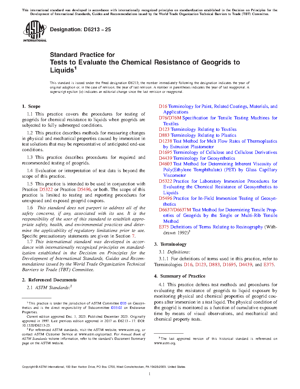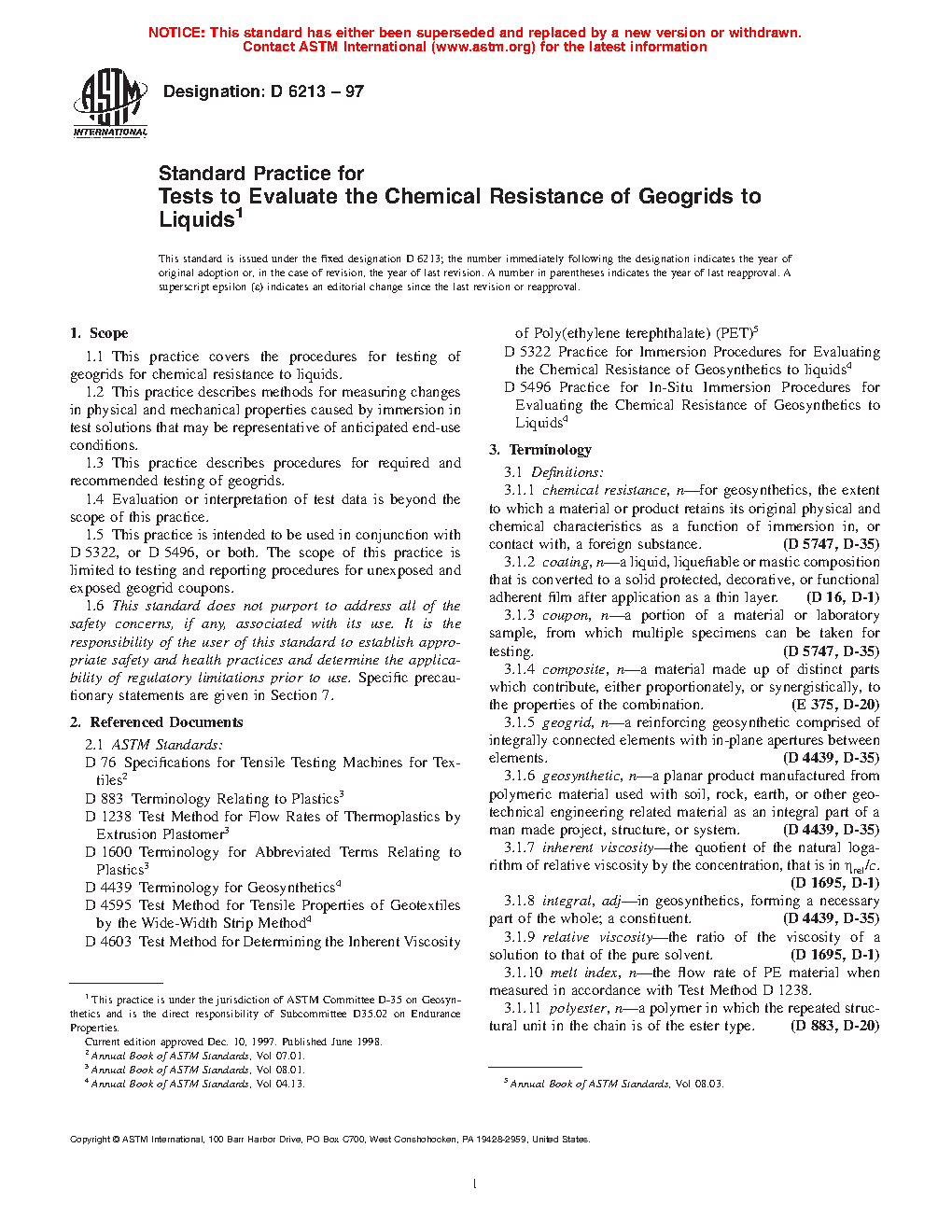 1.1 This practice covers the procedures for testing of geogrids for chemical resistance to liquids.