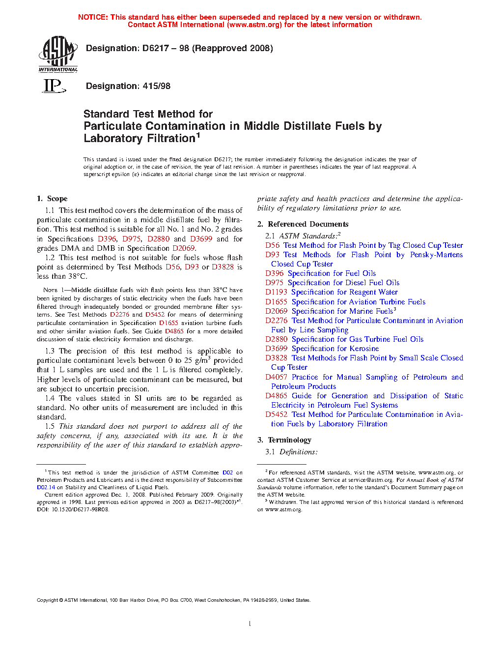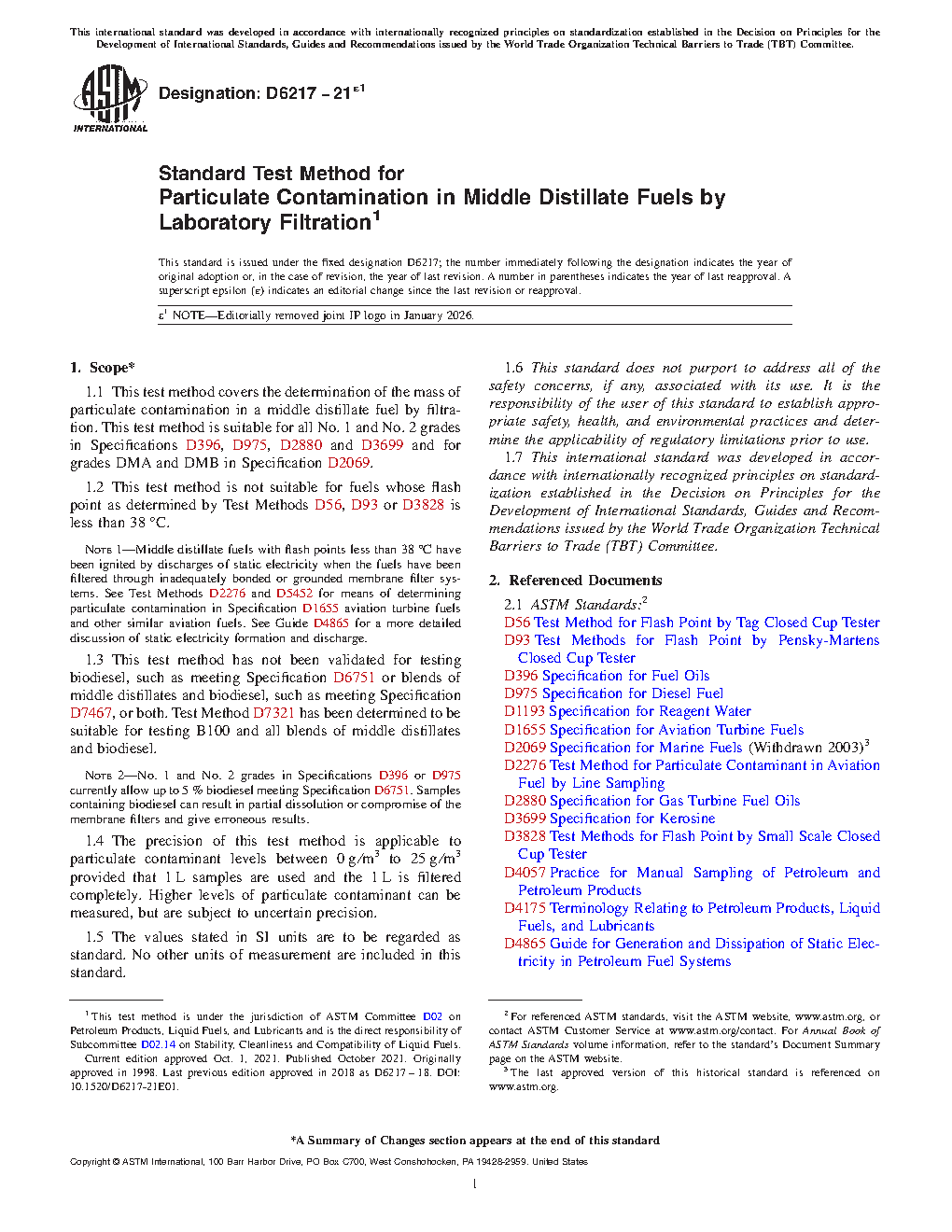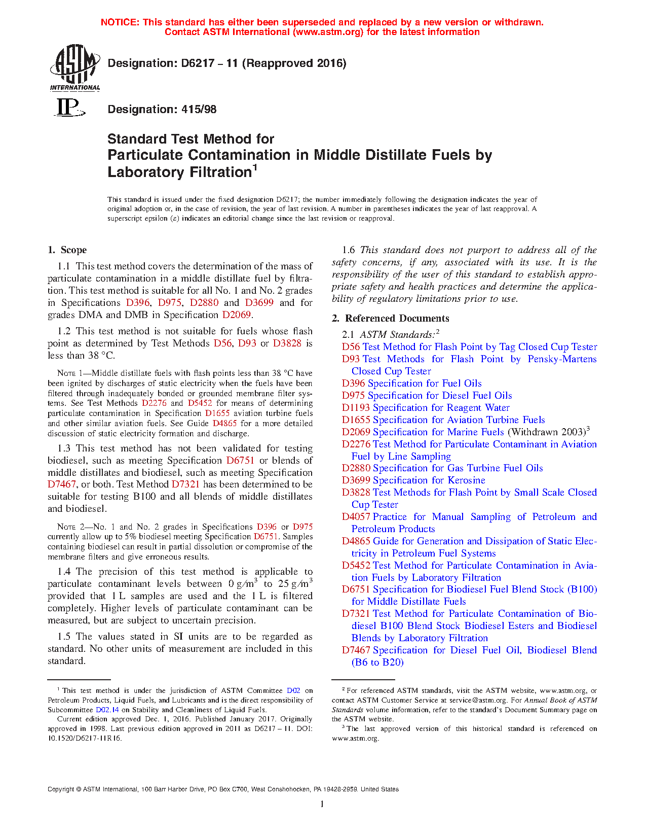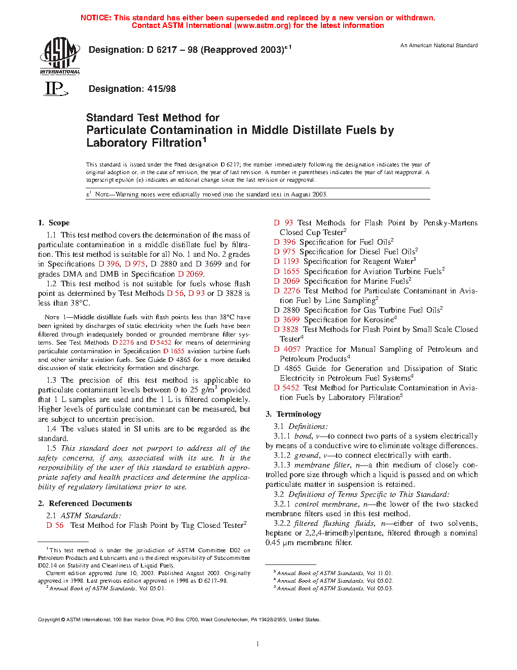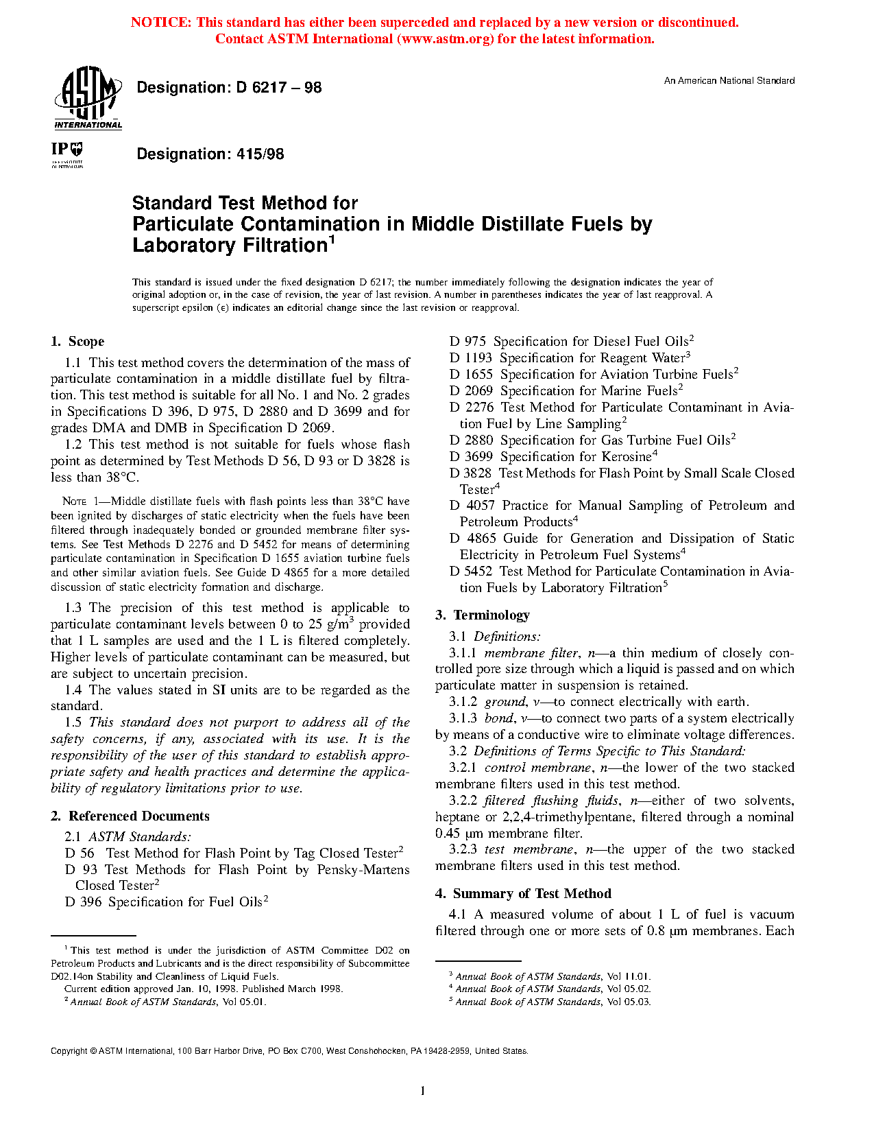 This is the first ASTM standard test method for assessing the mass quantity of particulates in middle distillate fuels. Test Method D 5452