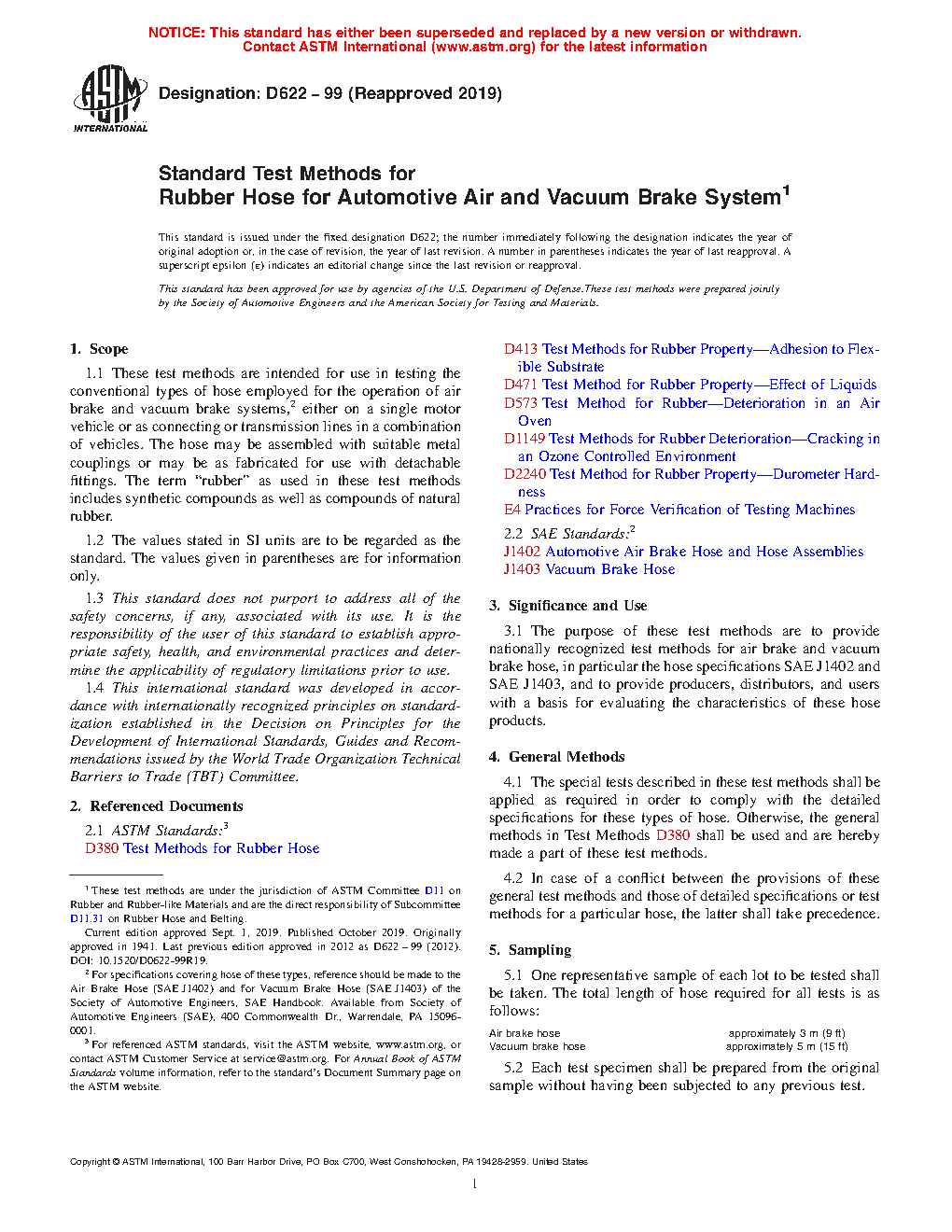 3.1 The purpose of these test methods are to provide nationally recognized test methods for air brake and vacuum brake hose, in particular the hose specifications SAE J1402 and SAE J1403, and to provide producers, distributors, and users with a basis for evaluating the characteristics of these hose products.
