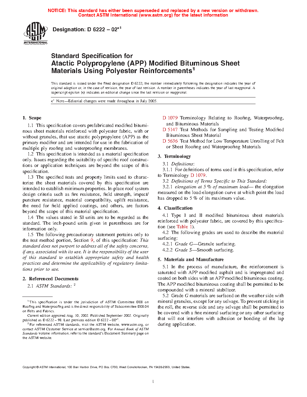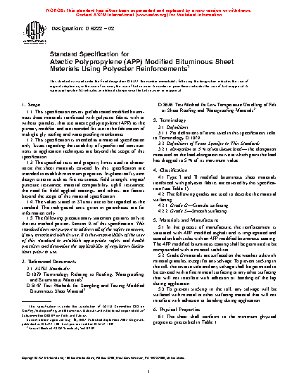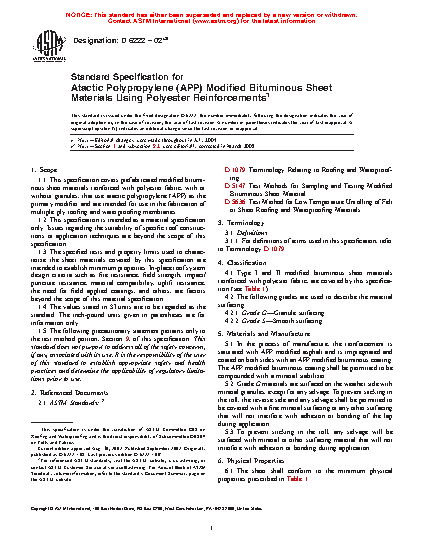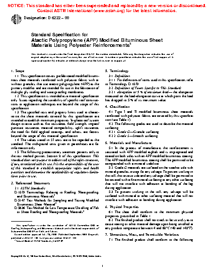 1.1 This specification covers prefabricated modified bituminous sheet materials reinforced with polyester fabric, with or without granules, that use atactic polypropylene (APP) as the primary modifier and are intended for use in the fabrication of multiple ply roofing and waterproofing membranes.