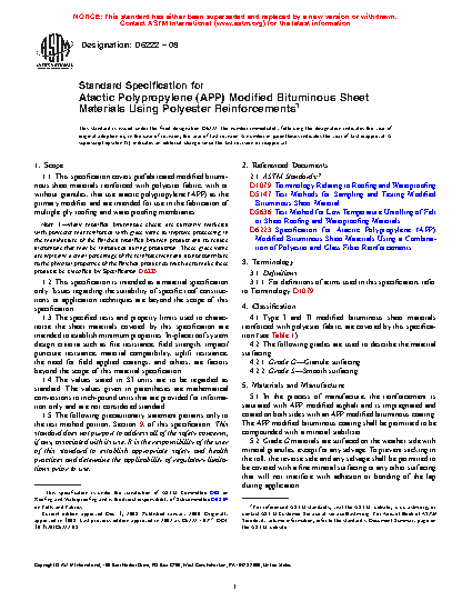 1.1 This specification covers prefabricated modified bituminous sheet materials reinforced with polyester fabric, with or without granules, that use atactic polypropylene (APP) as the primary modifier and are intended for use in the fabrication of multiple ply roofing and waterproofing membranes.