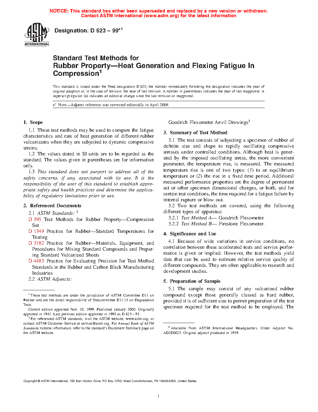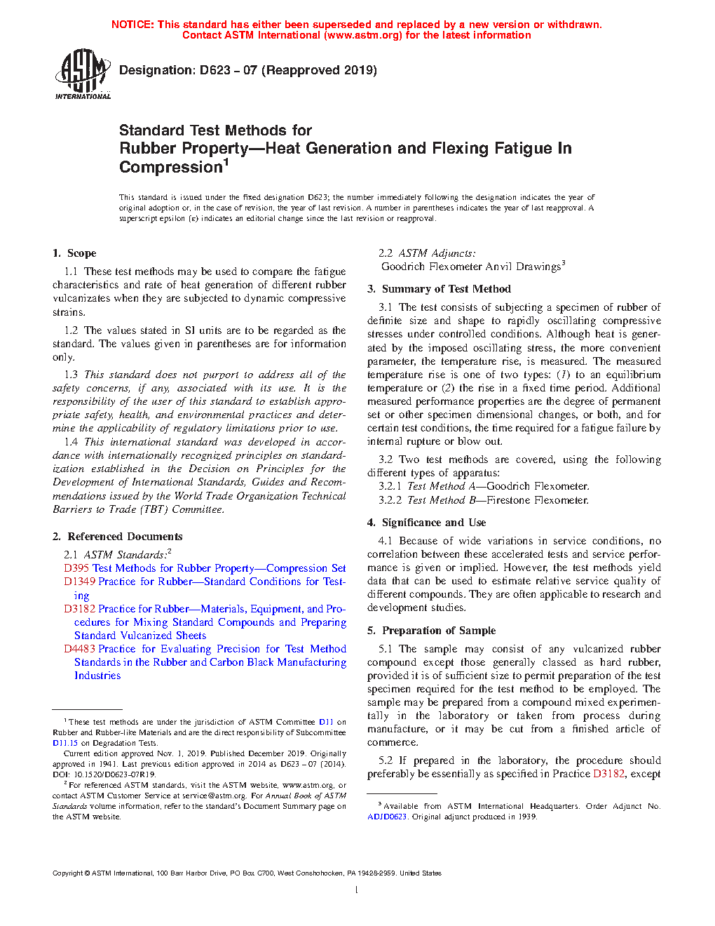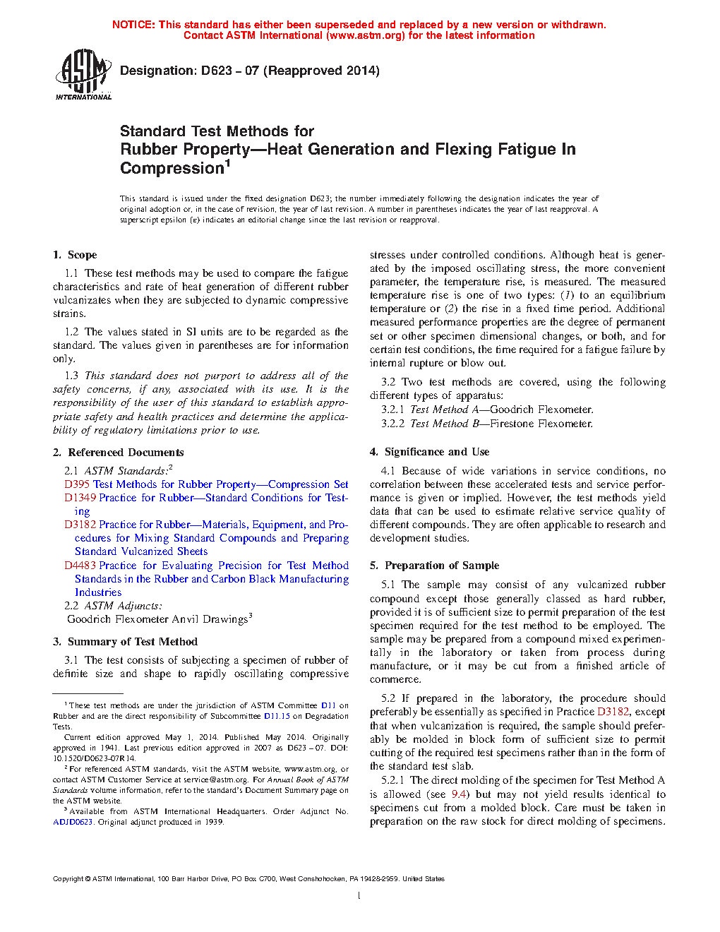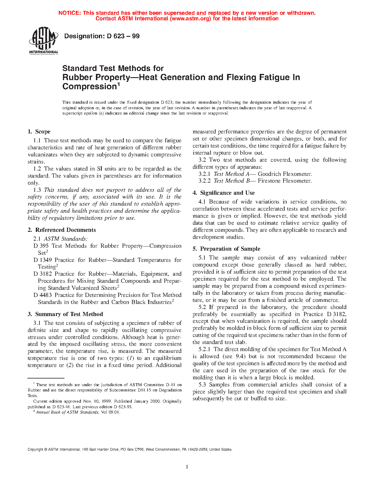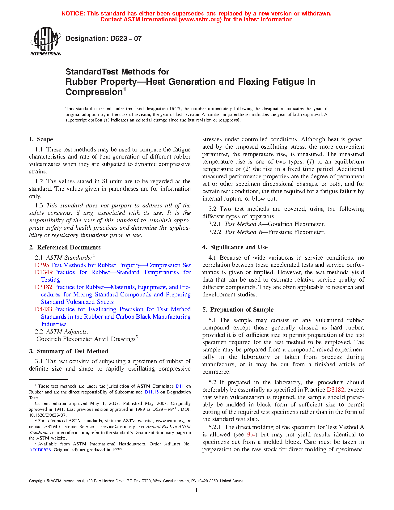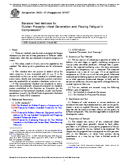 1.1 These test methods may be used to compare the fatigue characteristics and rate of heat generation of different rubber vulcanizates when they are subjected to dynamic compressive strains.