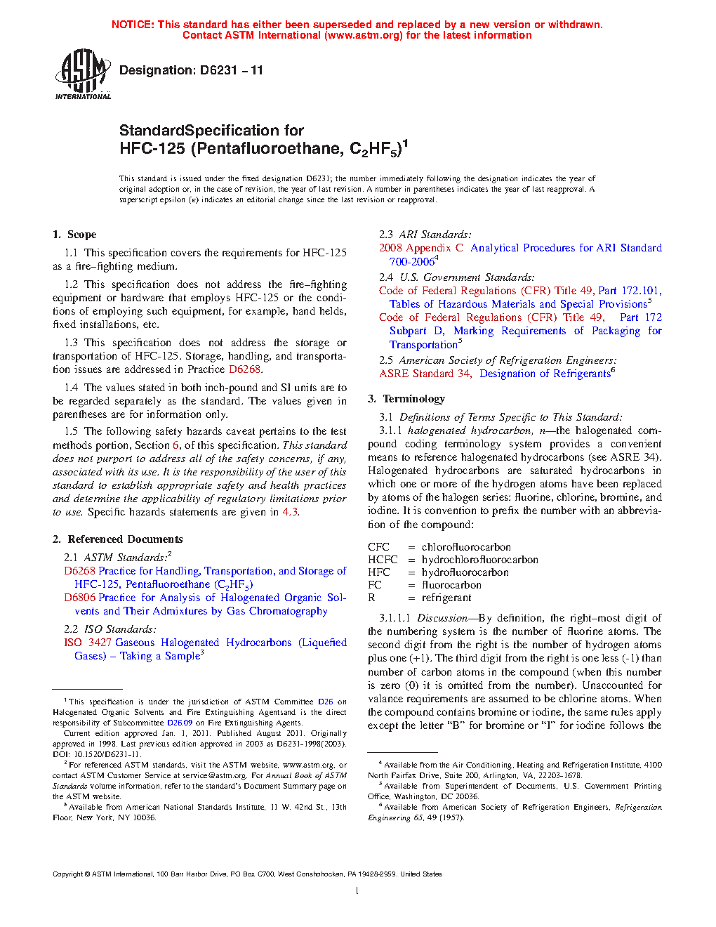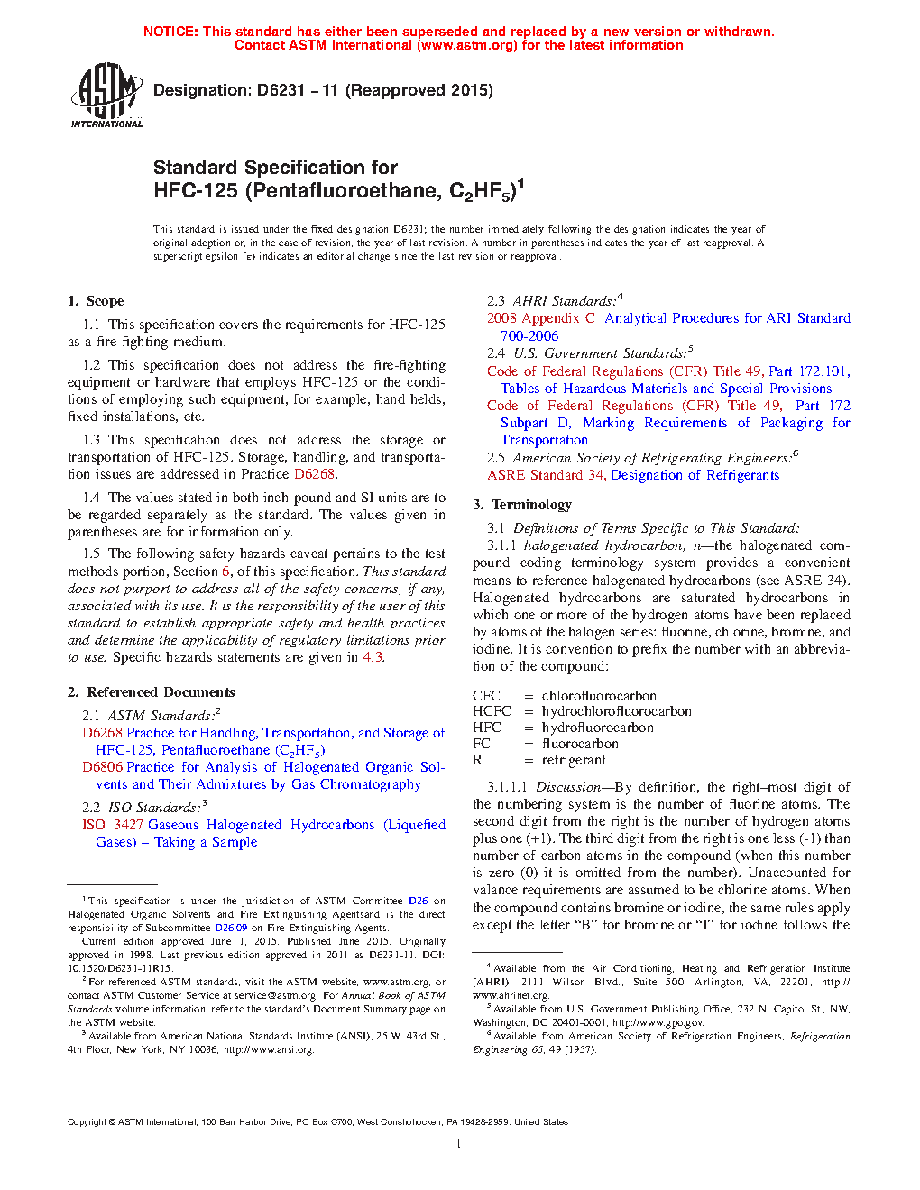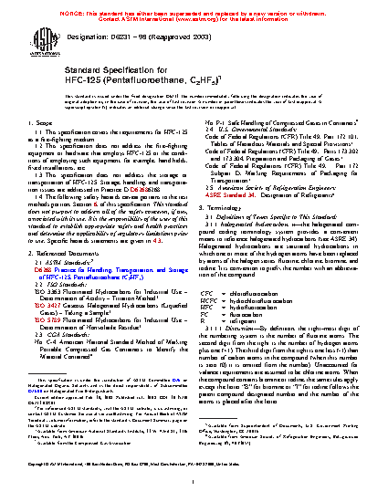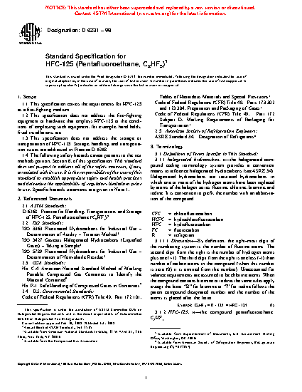 1.3 This specification does not address the storage or transportation of HFC-125. Storage, handling, and transportation issues are addressed in Practice D6268.
