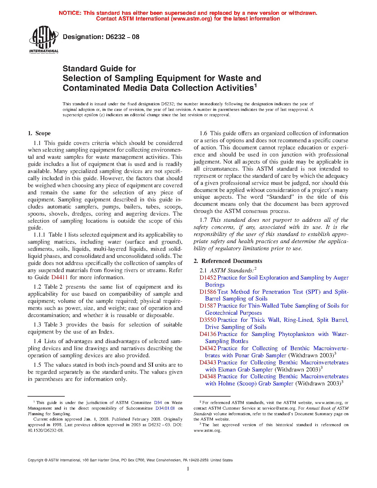 1.1 This guide covers criteria which should be considered when selecting sampling equipment for collecting environmental and waste samples for waste management activities. This guide includes a list of equipment that is used and is readily available. Many specialized sampling devices are not specifically included in this guide. However, the factors that should be weighed when choosing any piece of equipment are covered and remain the same for the selection of any piece of equipment. Sampling equipment described in this guide includes automatic samplers, pumps, bailers, tubes, scoops, spoons, shovels, dredges, coring and augering devices. The selection of sampling locations is outside the scope of this guide.