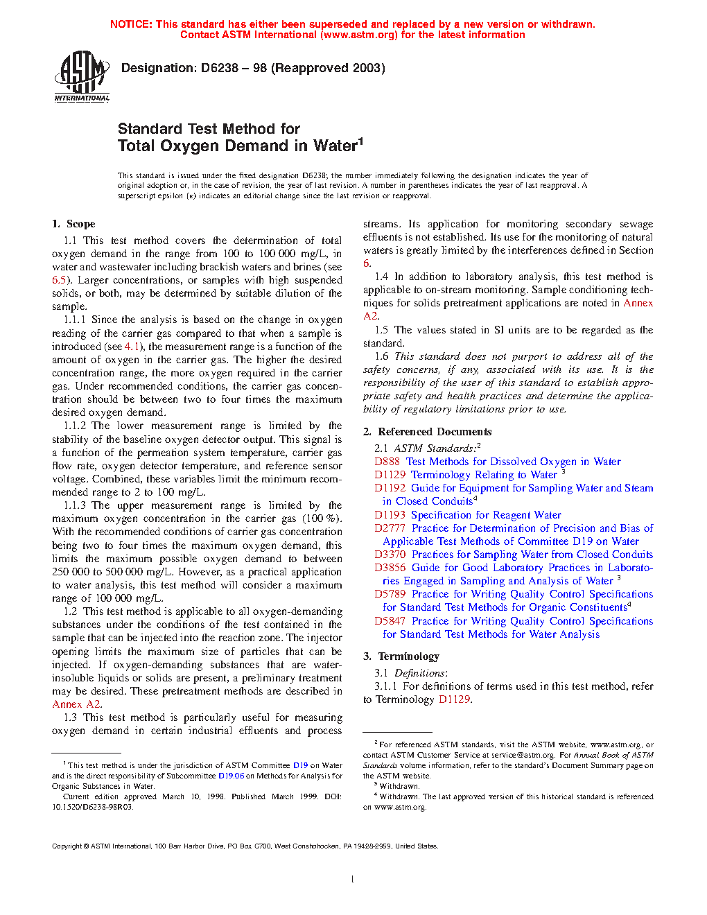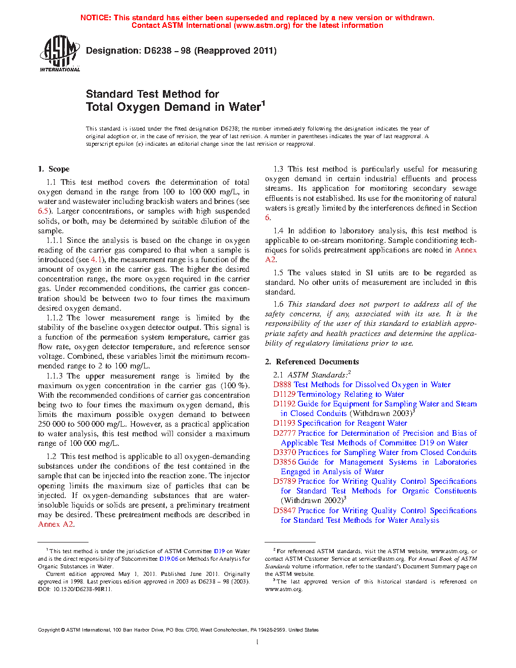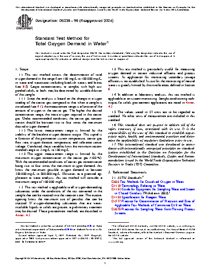 1.1 This test method covers the determination of total oxygen demand in the range from 100 to 100 000 mg/L, in water and wastewater including brackish waters and brines (see 6.5). Larger concentrations, or samples with high suspended solids, or both, may be determined by suitable dilution of the sample.