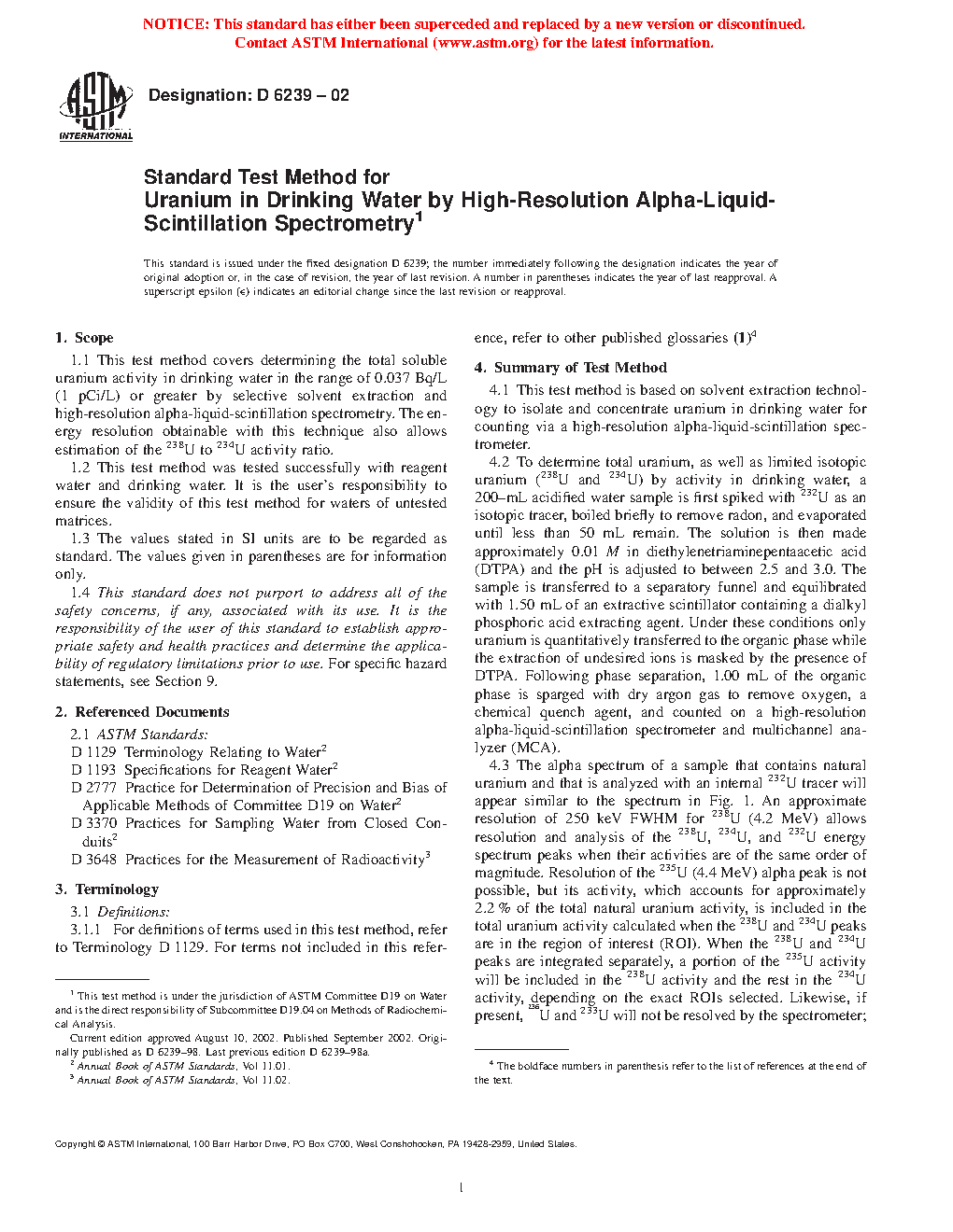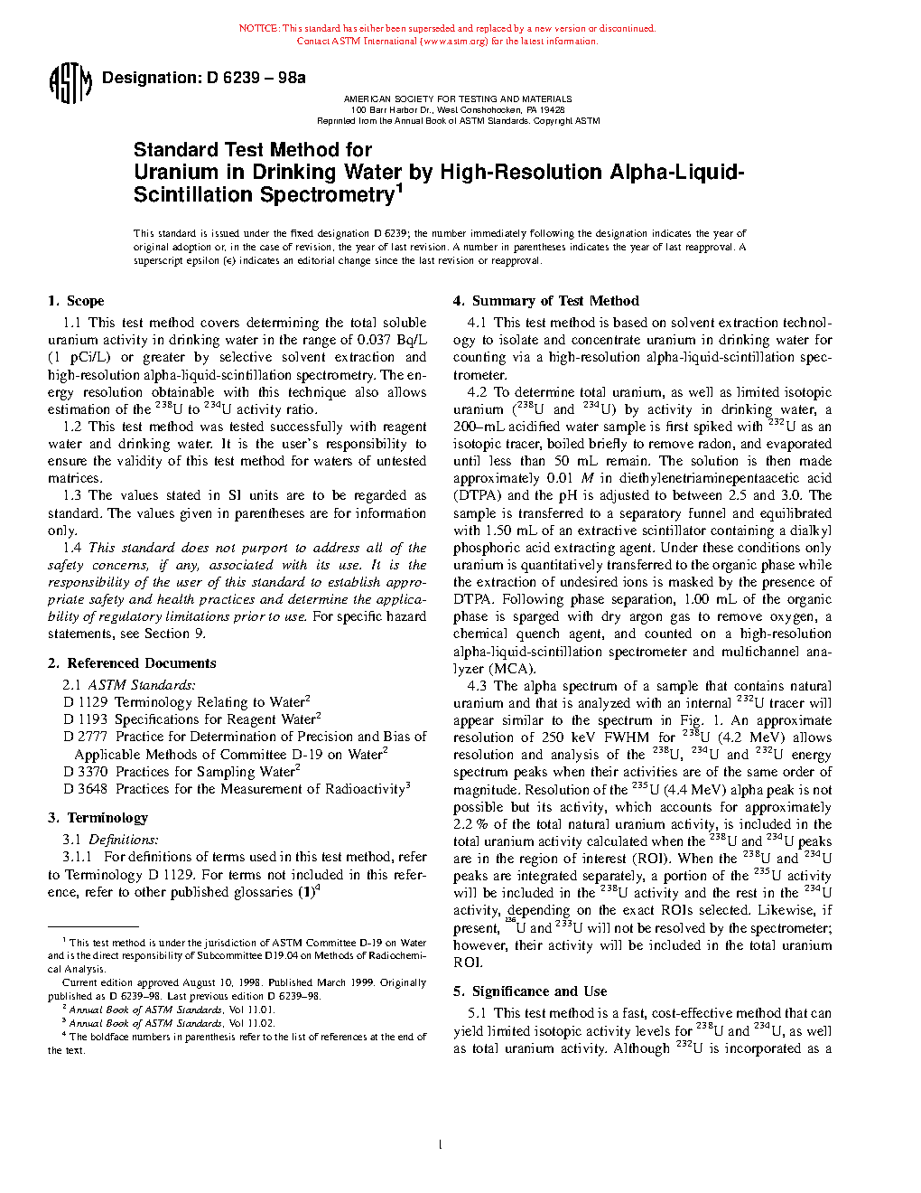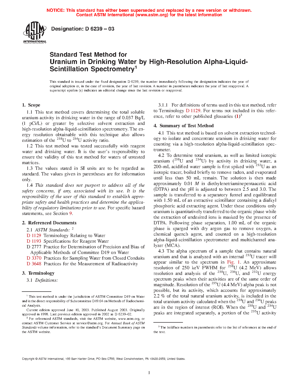 1.1 This test method covers determining the total soluble uranium activity in drinking water in the range of 0.037 Bq/L (1 pCi/L) or greater by selective solvent extraction and high-resolution alpha-liquid-scintillation spectrometry. The energy resolution obtainable with this technique also allows estimation of the 238U to 234U activity ratio.