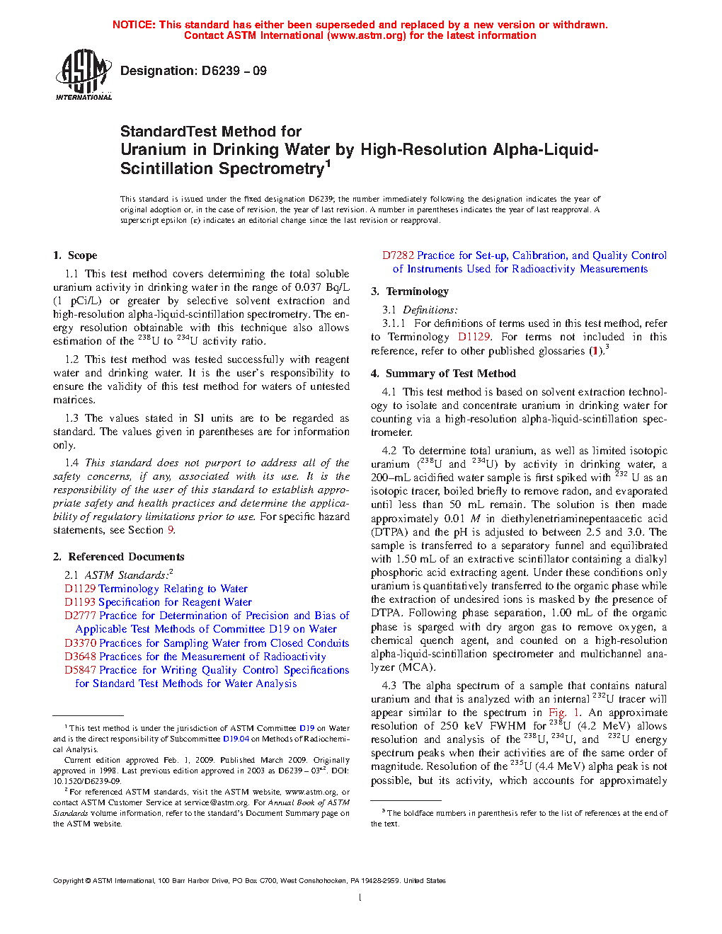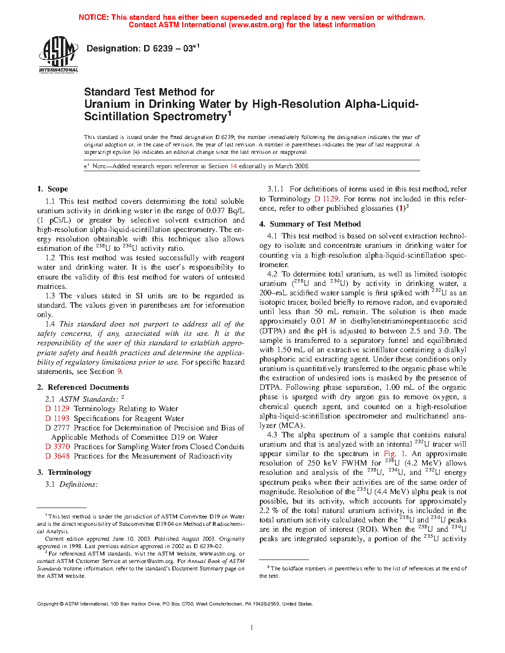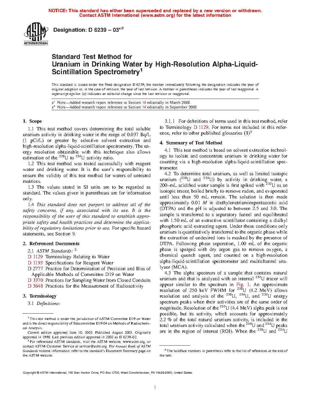 1.1 This test method covers determining the total soluble uranium activity in drinking water in the range of 0.037 Bq/L (1 pCi/L) or greater by selective solvent extraction and high-resolution alpha-liquid-scintillation spectrometry. The energy resolution obtainable with this technique also allows estimation of the 238U to 234U activity ratio.