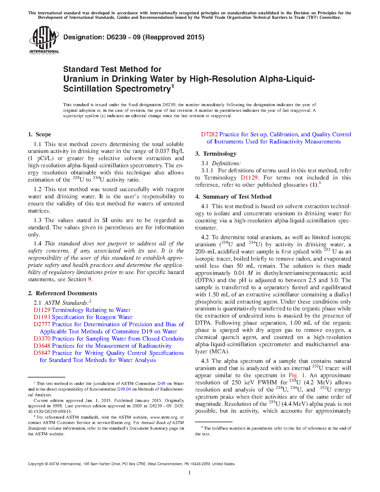 1.1 This test method covers determining the total soluble uranium activity in drinking water in the range of 0.037 Bq/L (1 pCi/L) or greater by selective solvent extraction and high-resolution alpha-liquid-scintillation spectrometry. The energy resolution obtainable with this technique also allows estimation of the 238U to 234U activity ratio.