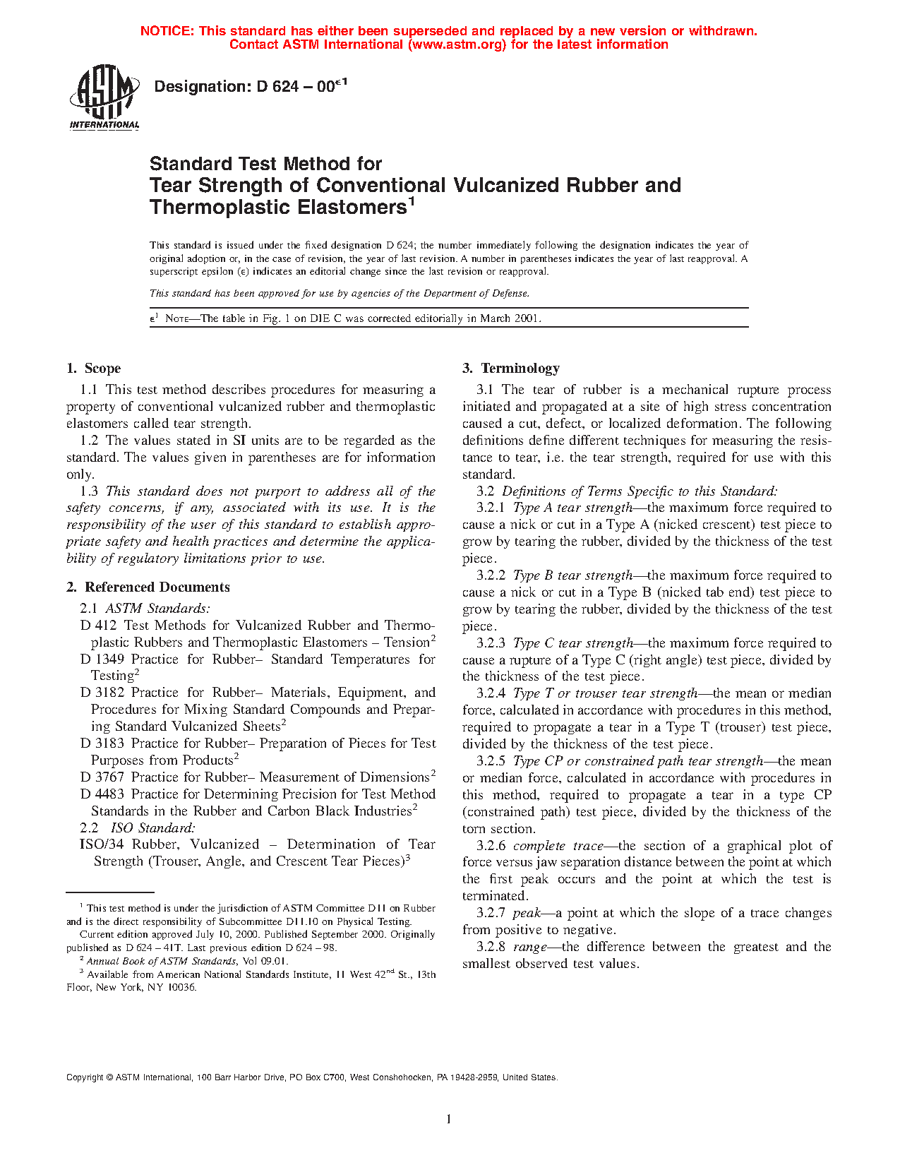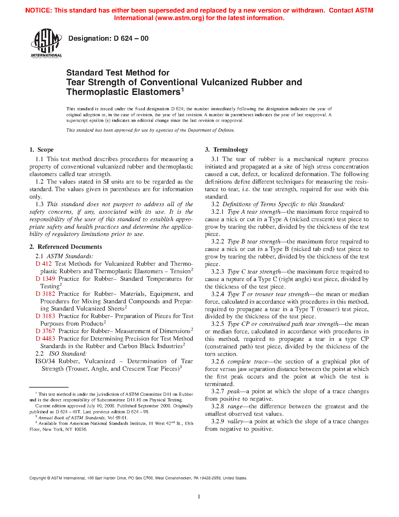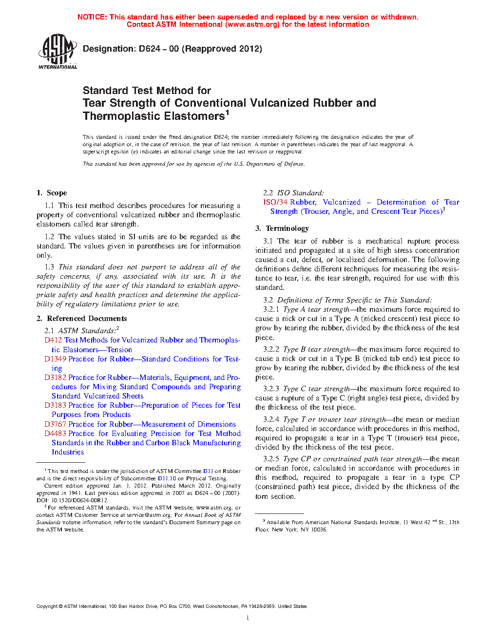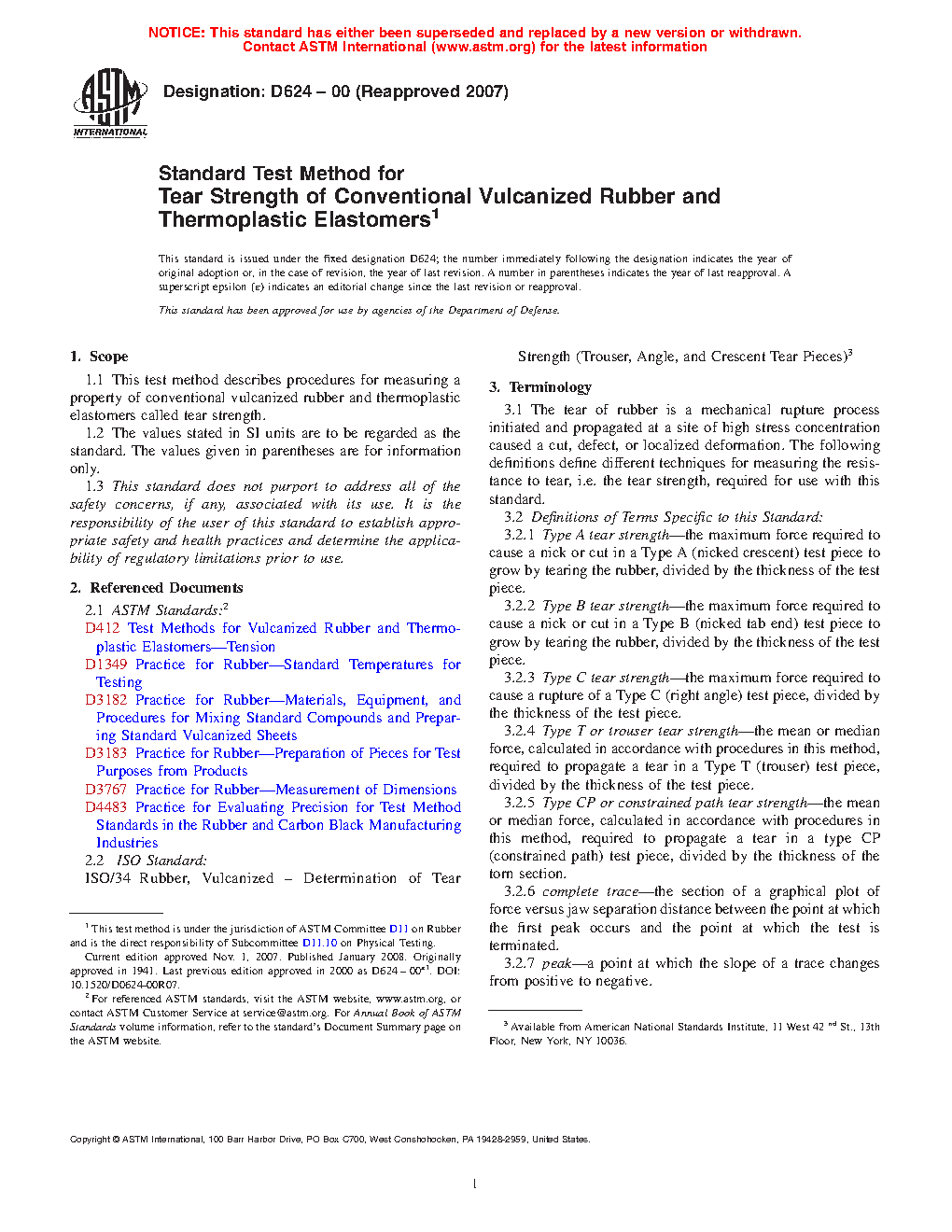 5.1 Vulcanized rubber and thermoplastic elastomers (TPE) often fail in service due to the generation and propagation of a special type of rupture called a tear. This test method measures the resistance to tearing action.
