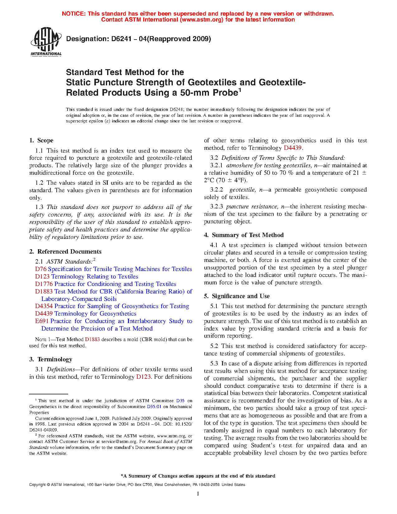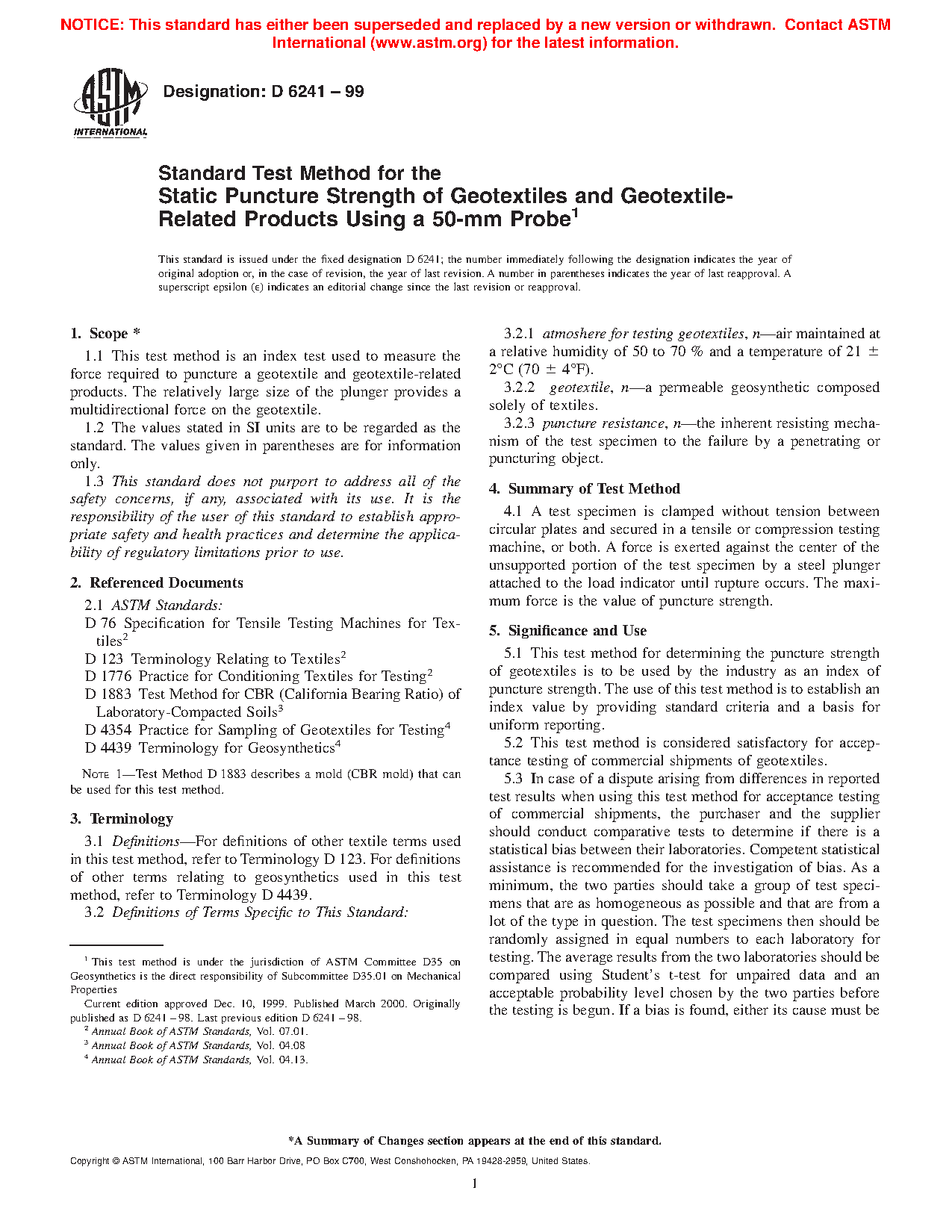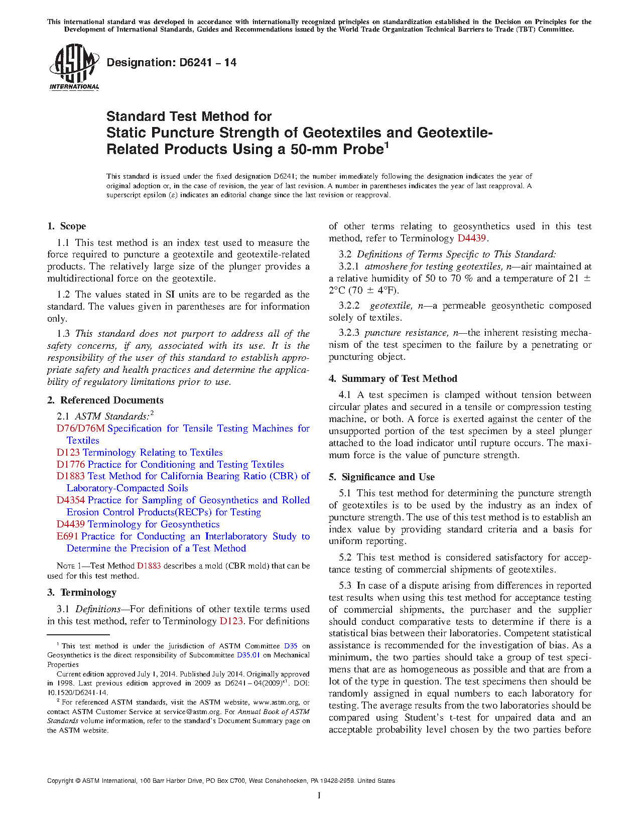 1.1 This test method is an index test used to measure the force required to puncture a geotextile and geotextile-related products with a 50 mm diameter probe rod. The dimensions of the probe provide a multidirectional force on the geotextile.