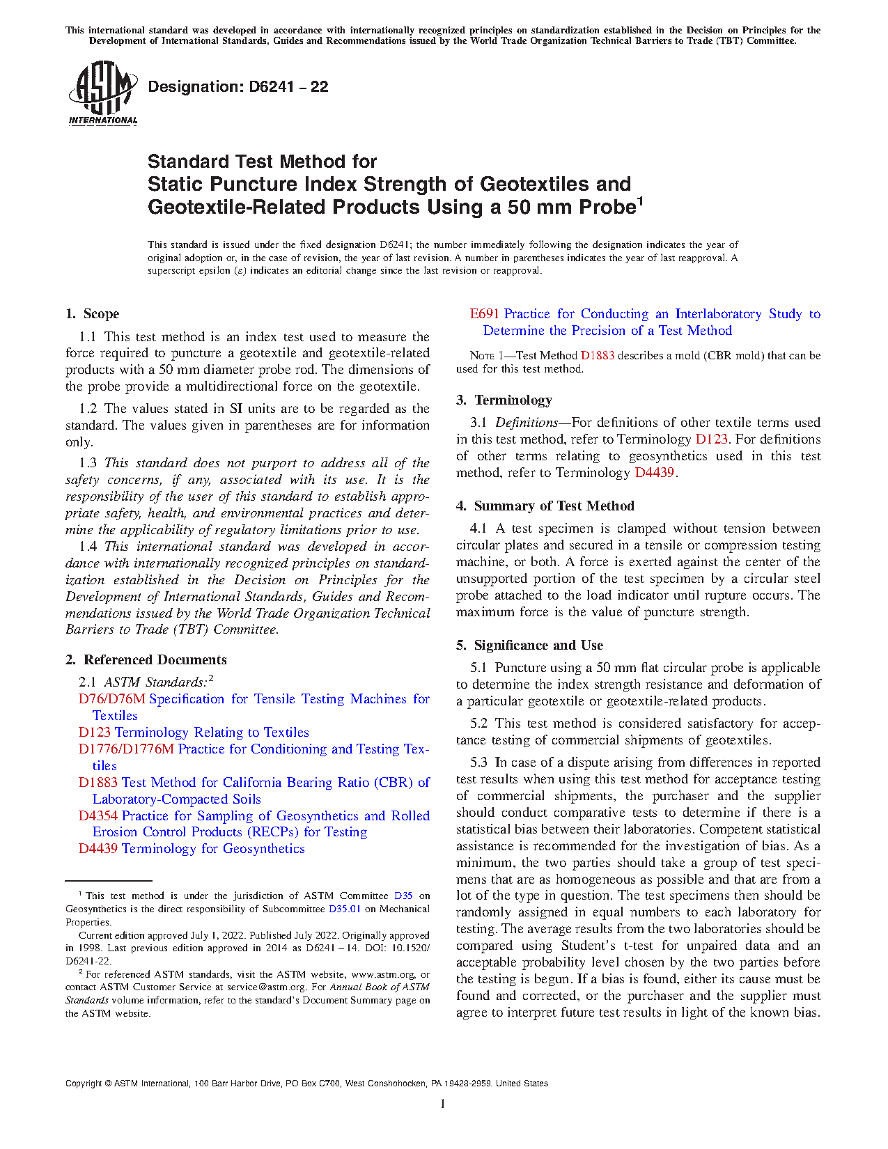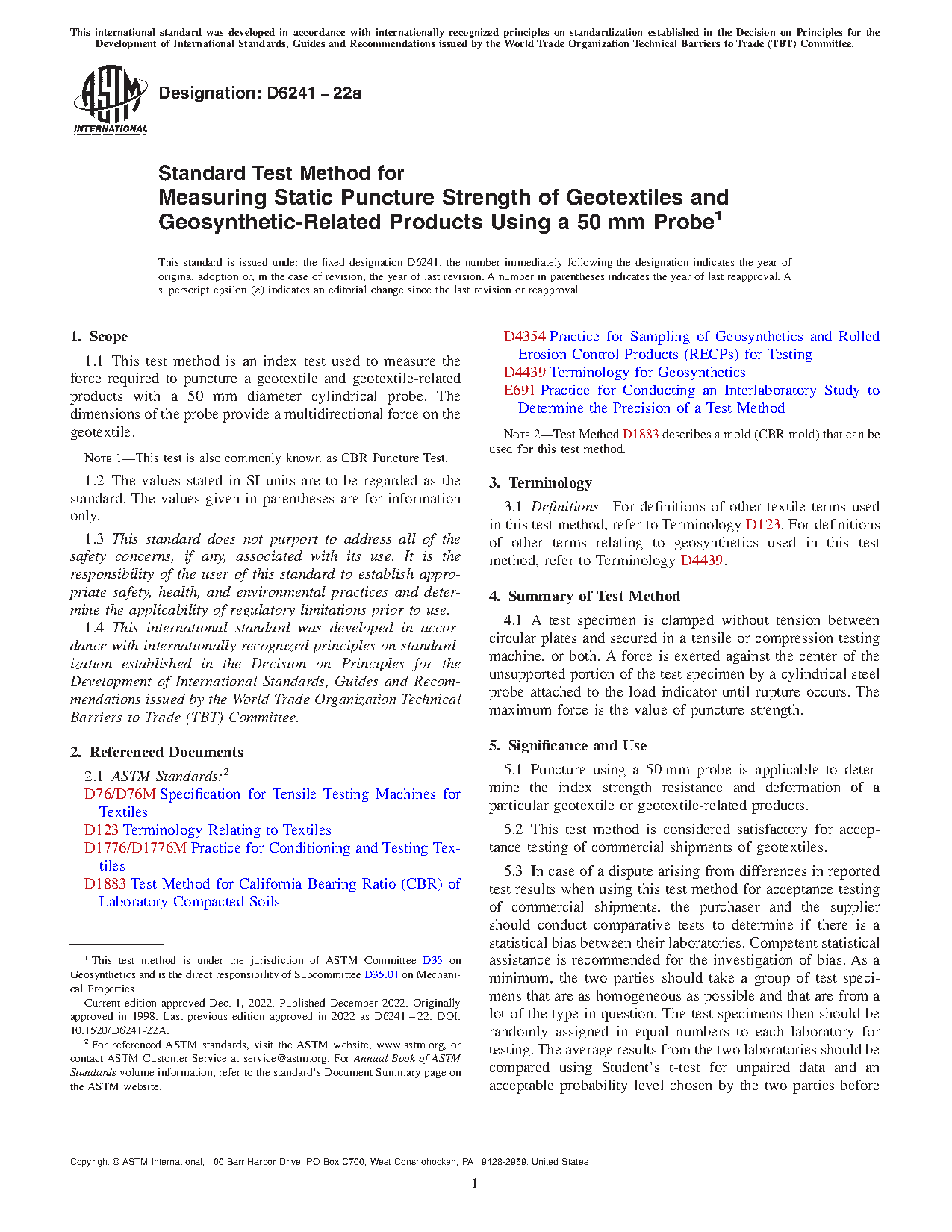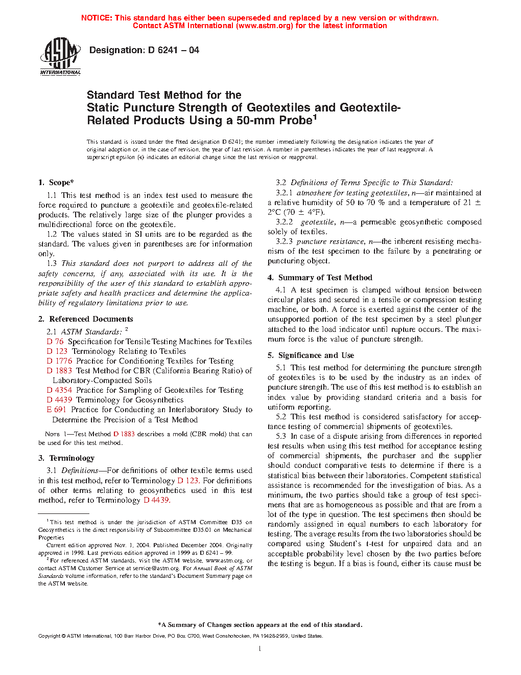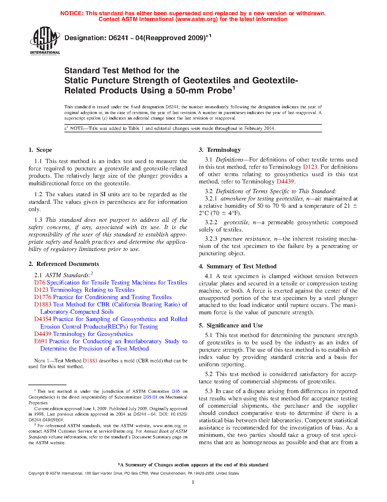 1.1 This test method is an index test used to measure the force required to puncture a geotextile and geotextile-related products with a 50 mm diameter probe rod. The dimensions of the probe provide a multidirectional force on the geotextile.