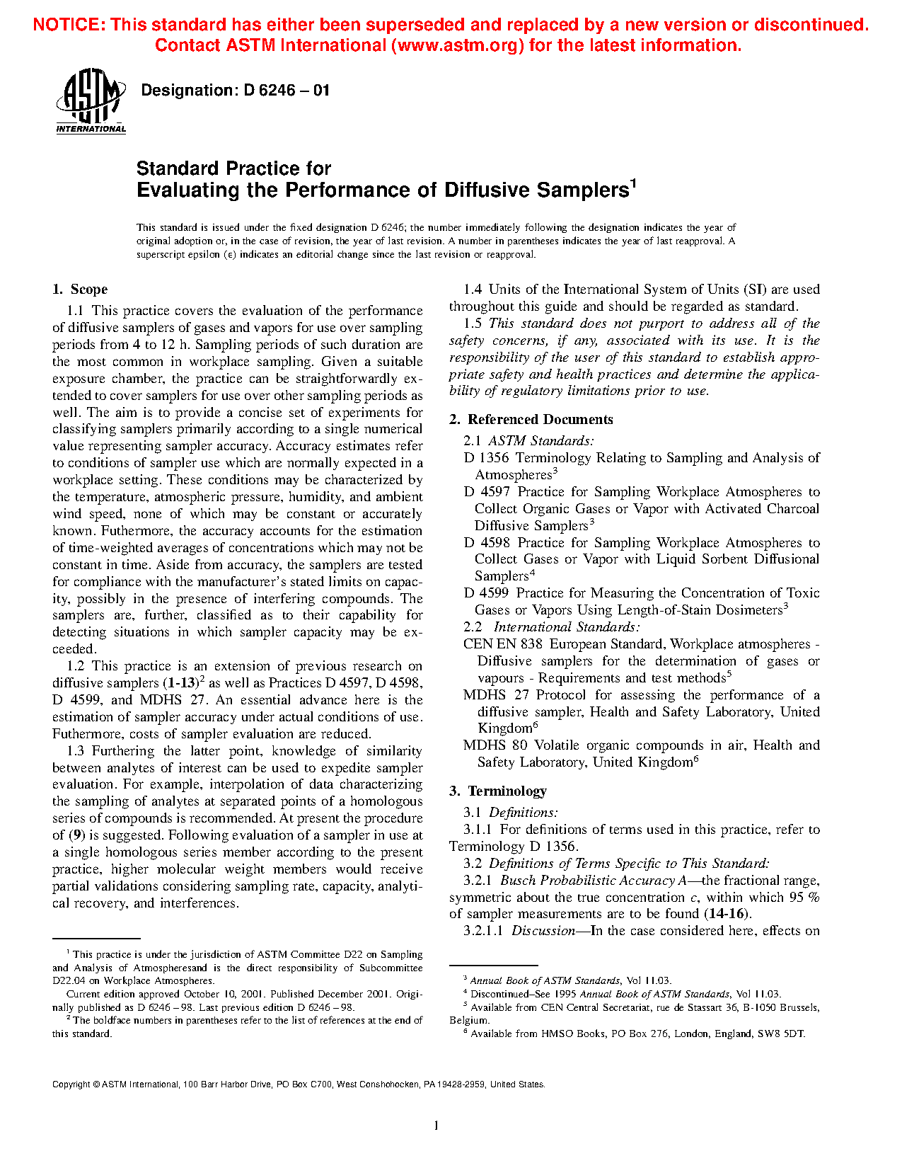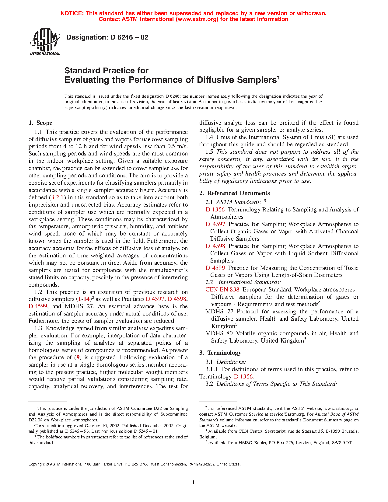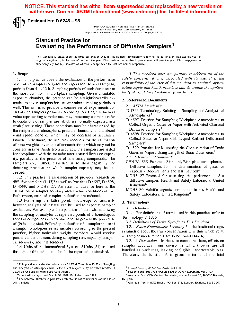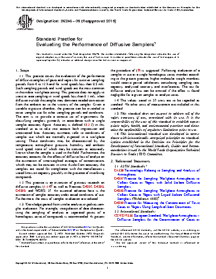 1.2 This practice is an extension of previous research on diffusive samplers (1-14)2 as well as Practices D4597, D4598, D4599, and MDHS 27. An essential advance here is the estimation of sampler accuracy under actual conditions of use. Furthermore, the costs of sampler evaluation are reduced.
