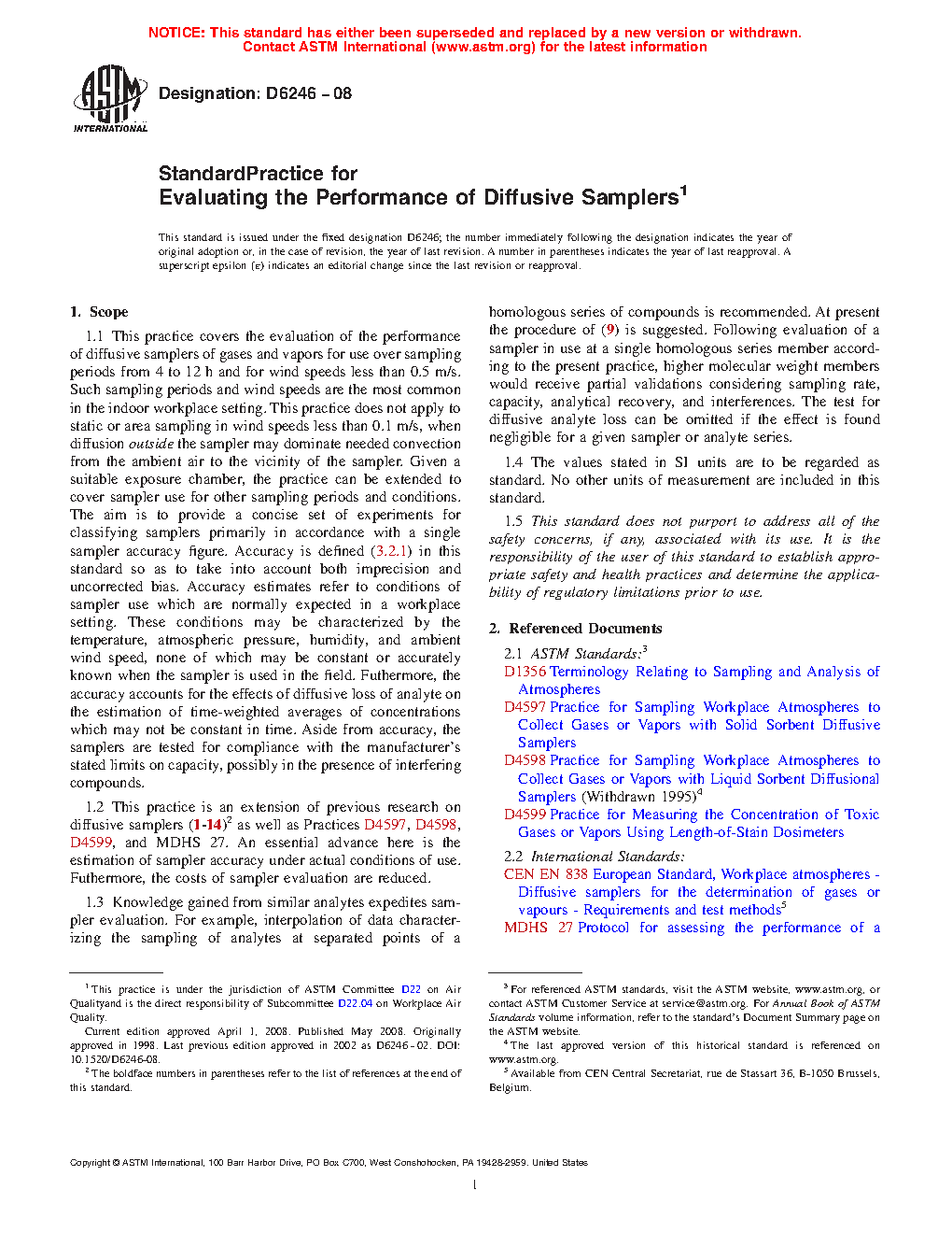 5.2 However, previous studies have found significant problems with the accuracy of some samplers. Therefore, although diffusive samplers may provide a plethora of data, inaccuracies and misuse of diffusive samplers may yet affect research studies. Furthermore, worker protections may be based on faulty assumptions. The aim of this practice is to counter the uncertainties in diffusive sampling through achieving a broadly accepted set of performance tests and acceptance criteria for proving the efficacy of any given diffusive sampler intended for use.