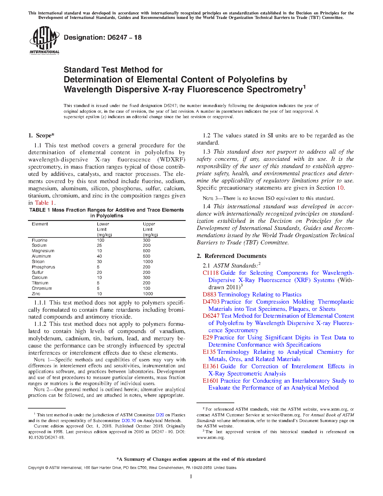 1.1 This test method covers a general procedure for the determination of elemental content in polyolefins by wavelength-dispersive X-ray fluorescence (WDXRF) spectrometry, in mass fraction ranges typical of those contributed by additives, catalysts, and reactor processes. The elements covered by this test method include fluorine, sodium, magnesium, aluminum, silicon, phosphorus, sulfur, calcium, titanium, chromium, and zinc in the composition ranges given in Table 1.