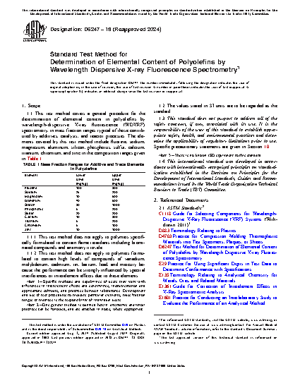 1.1 This test method covers a general procedure for the determination of elemental content in polyolefins by wavelength-dispersive X-ray fluorescence (WDXRF) spectrometry, in mass fraction ranges typical of those contributed by additives, catalysts, and reactor processes. The elements covered by this test method include fluorine, sodium, magnesium, aluminum, silicon, phosphorus, sulfur, calcium, titanium, chromium, and zinc in the composition ranges given in Table 1.