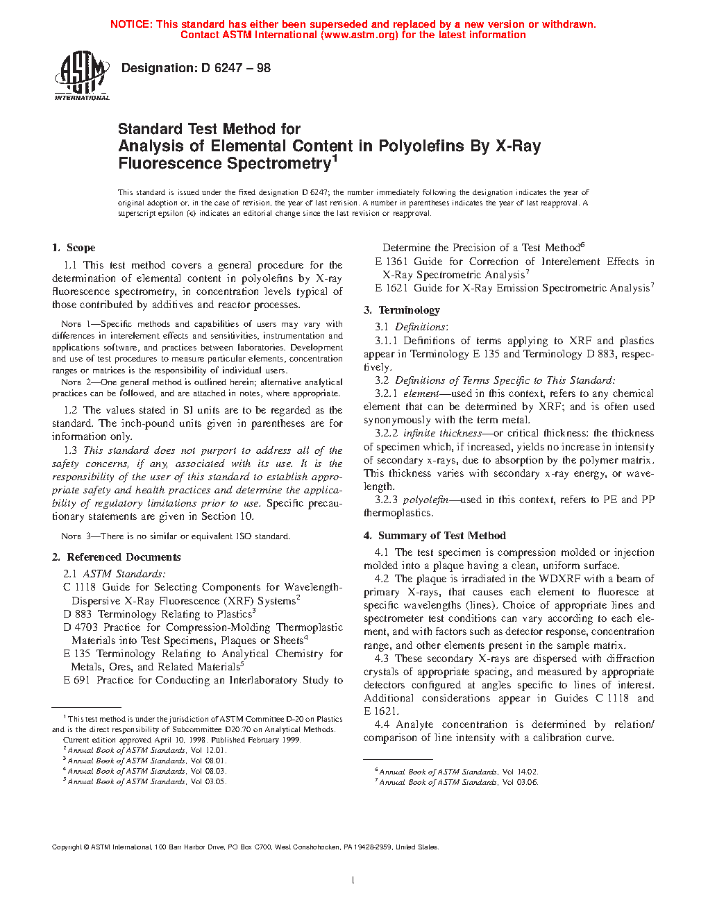 5.1 Elemental analysis serves as a quality control measure for post-reactor studies, for additive levels in formulated resins, and for finished products. X-ray fluorescence spectrometry is an accurate and relatively fast method to determine mass fractions of multiple elements in polyethylene and polypropylene materials.