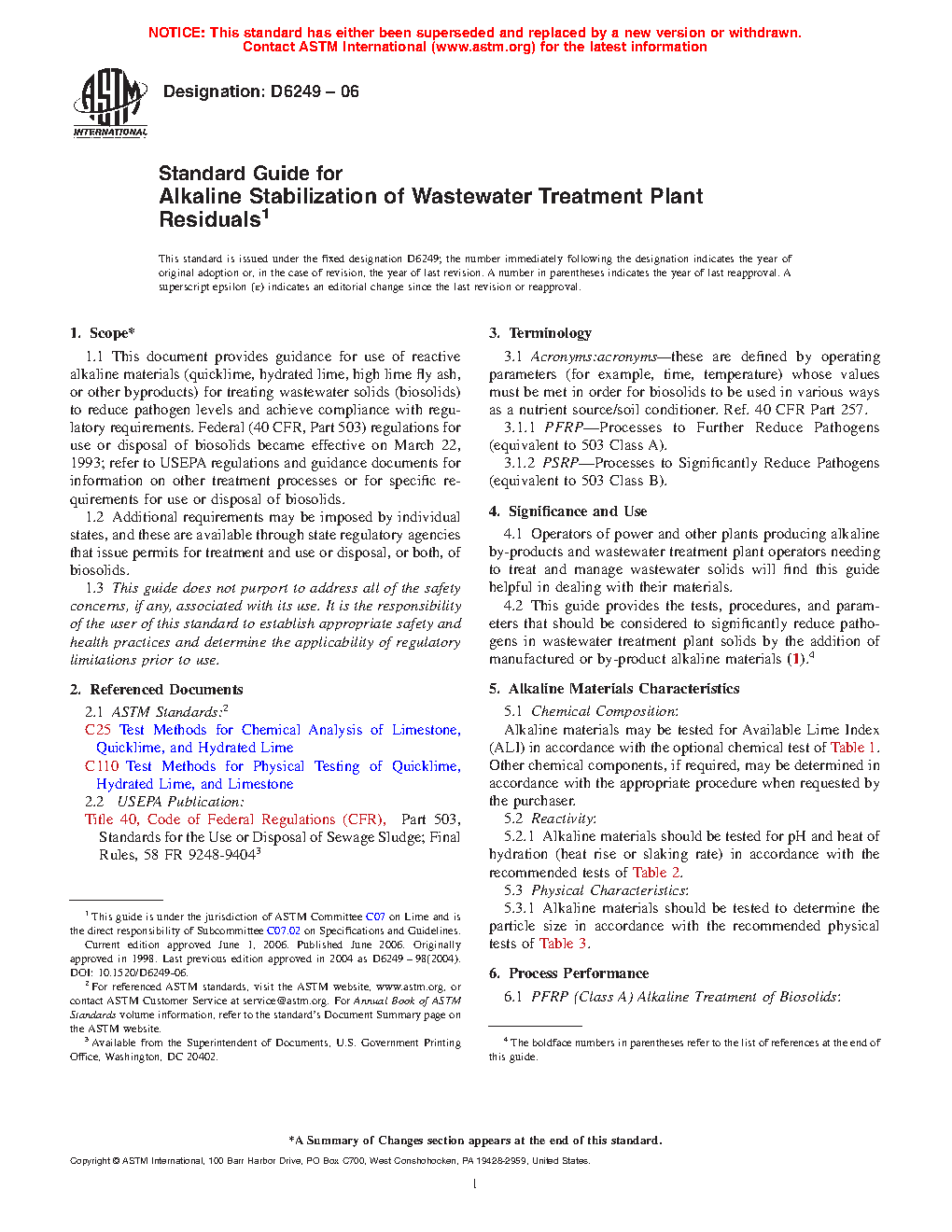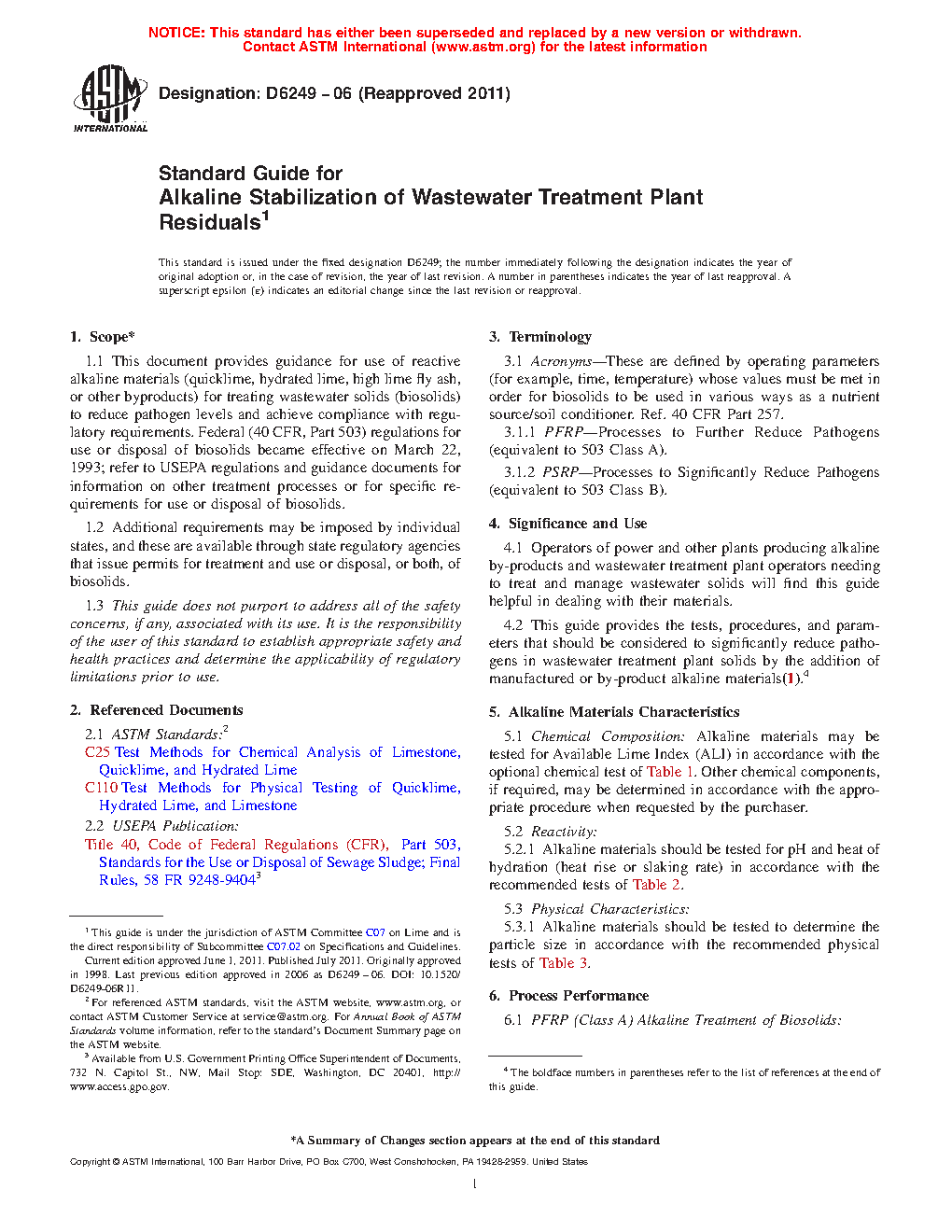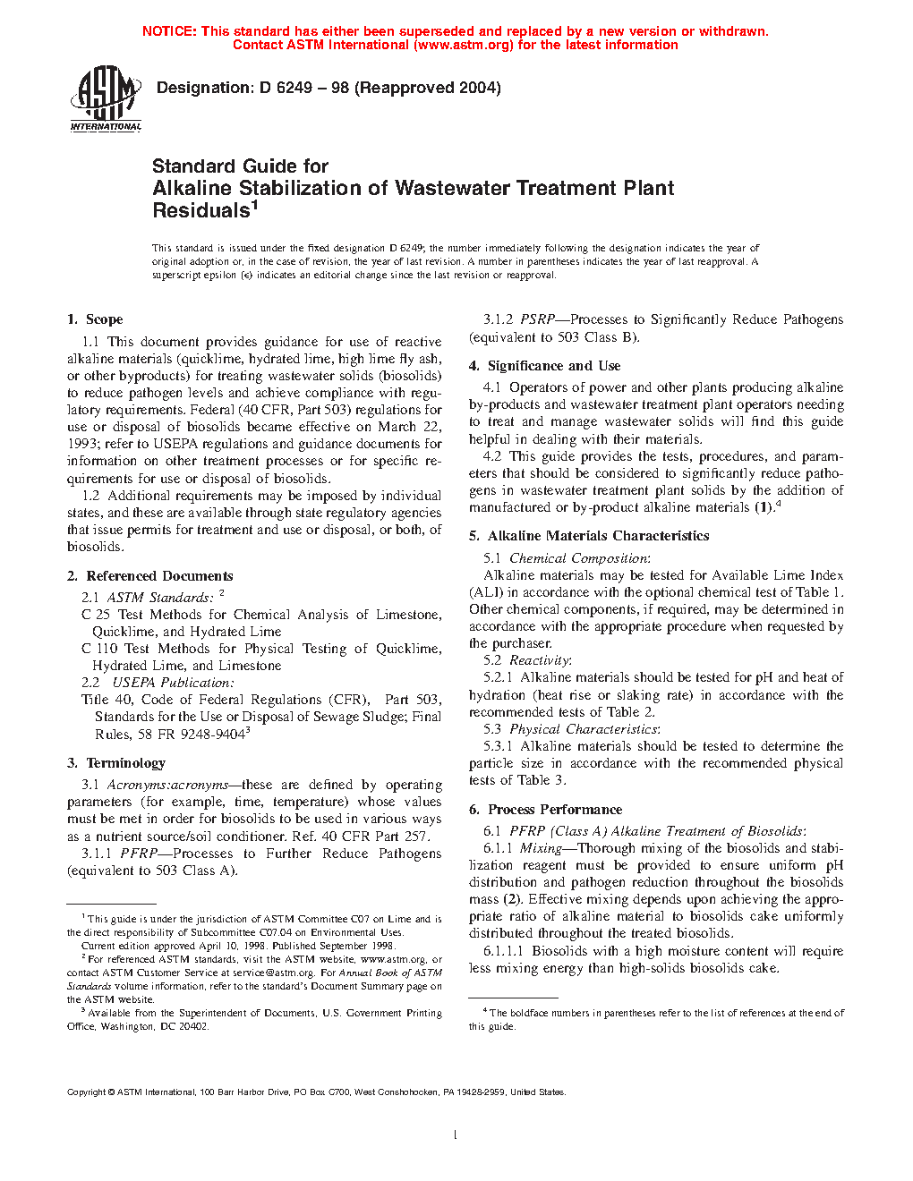 4.2 This guide provides the tests, procedures, and parameters that should be considered to significantly reduce pathogens in wastewater treatment plant solids by the addition of manufactured or by-product alkaline materials(1).4