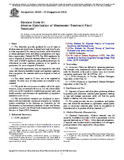 1.1 This document provides guidance for use of reactive alkaline materials (quicklime, hydrated lime, high lime fly ash, or other byproducts) for treating wastewater solids (biosolids) to reduce pathogen levels and achieve compliance with regulatory requirements. Federal (40 CFR, Part 503) regulations for use or disposal of biosolids became effective on March 22, 1993; refer to USEPA regulations and guidance documents for information on other treatment processes or for specific requirements for use or disposal of biosolids.