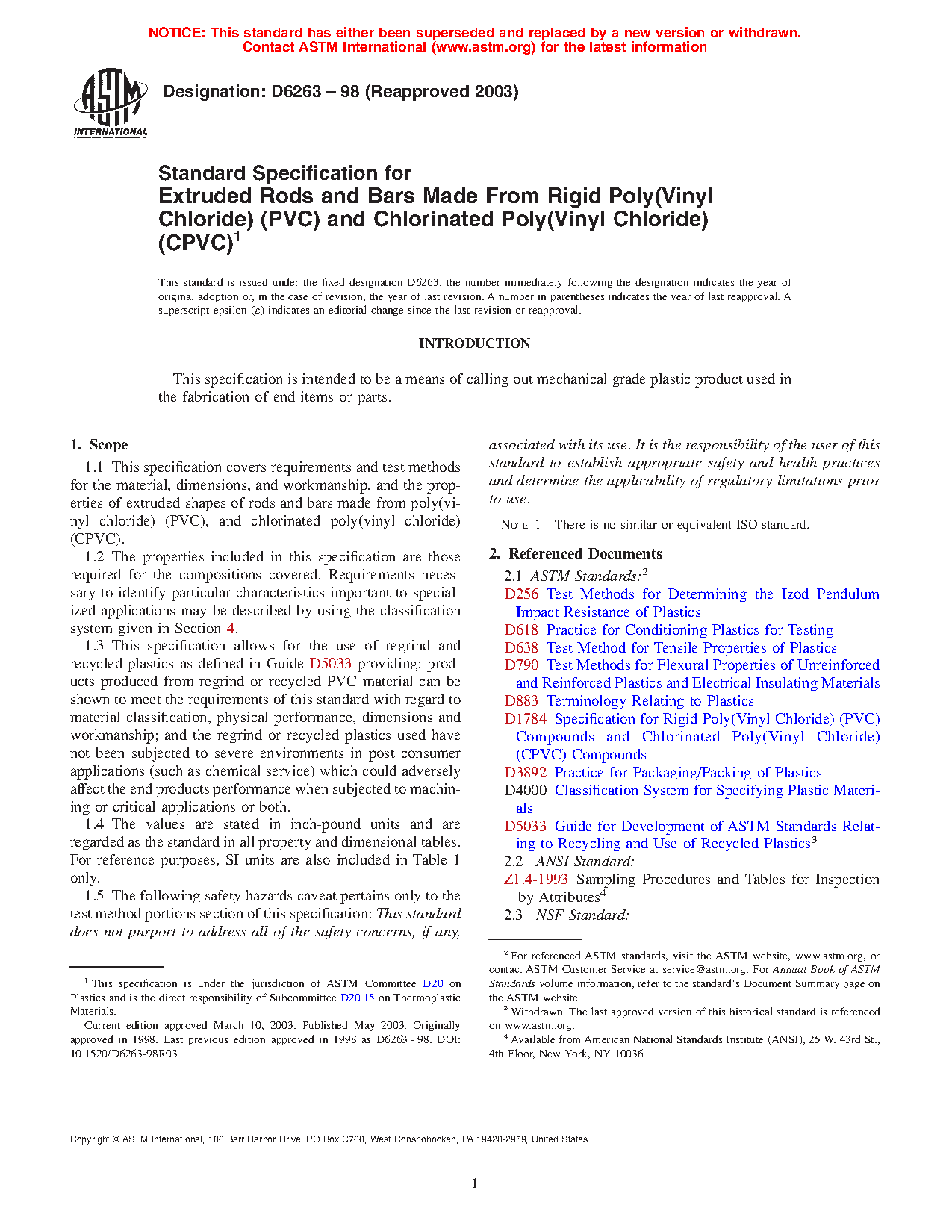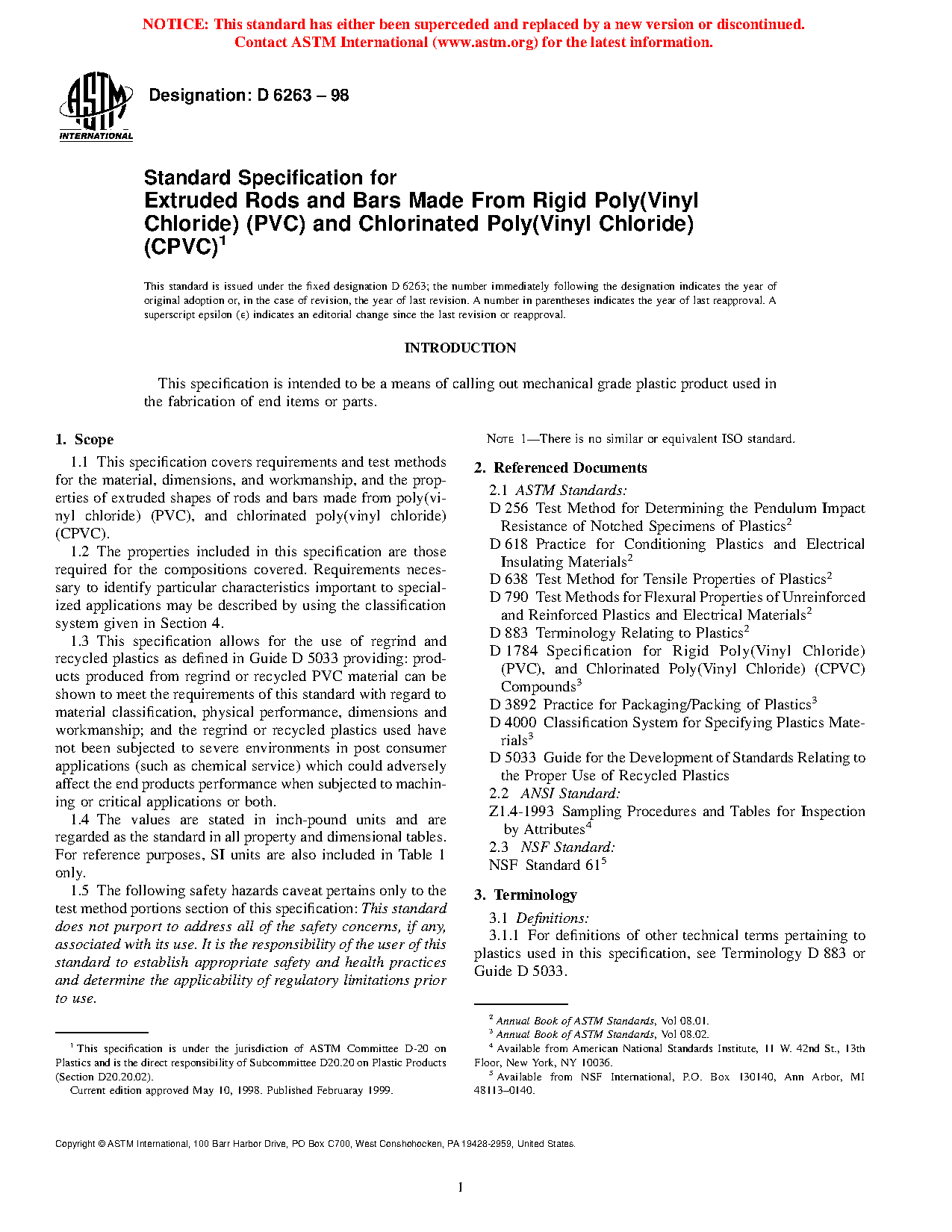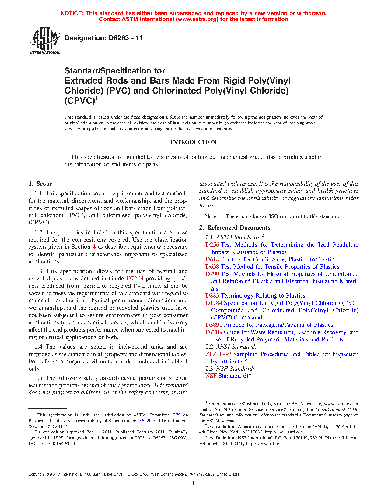 1.3 This specification allows for the use of regrind and recycled plastics as defined in Guide D7209 providing: products produced from regrind or recycled PVC material can be shown to meet the requirements of this standard with regard to material classification, physical performance, dimensions and workmanship; and the regrind or recycled plastics used have not been subjected to severe environments in post consumer applications (such as chemical service) which could adversely affect the end products performance when subjected to machining or critical applications or both.